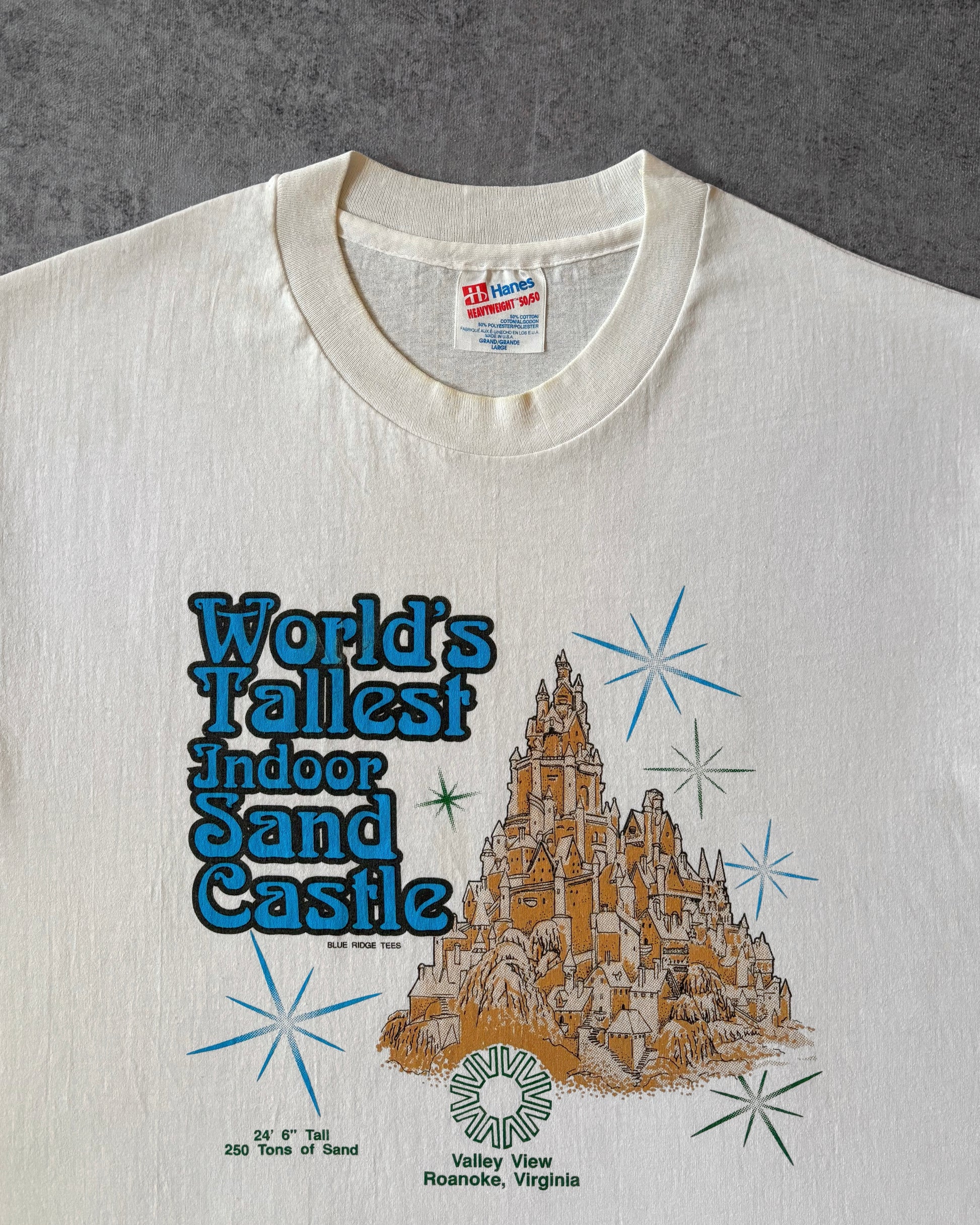 Vintage "World's Tallest Indoor Sand Castle" T-shirt, featuring a detailed graphic of a towering sandcastle adorned with retro-style stars. Celebrate the iconic event at Valley View Mall in Roanoke, Virginia, famous for the construction of a 24-foot, 6-inch castle made from 250 tons of sand.