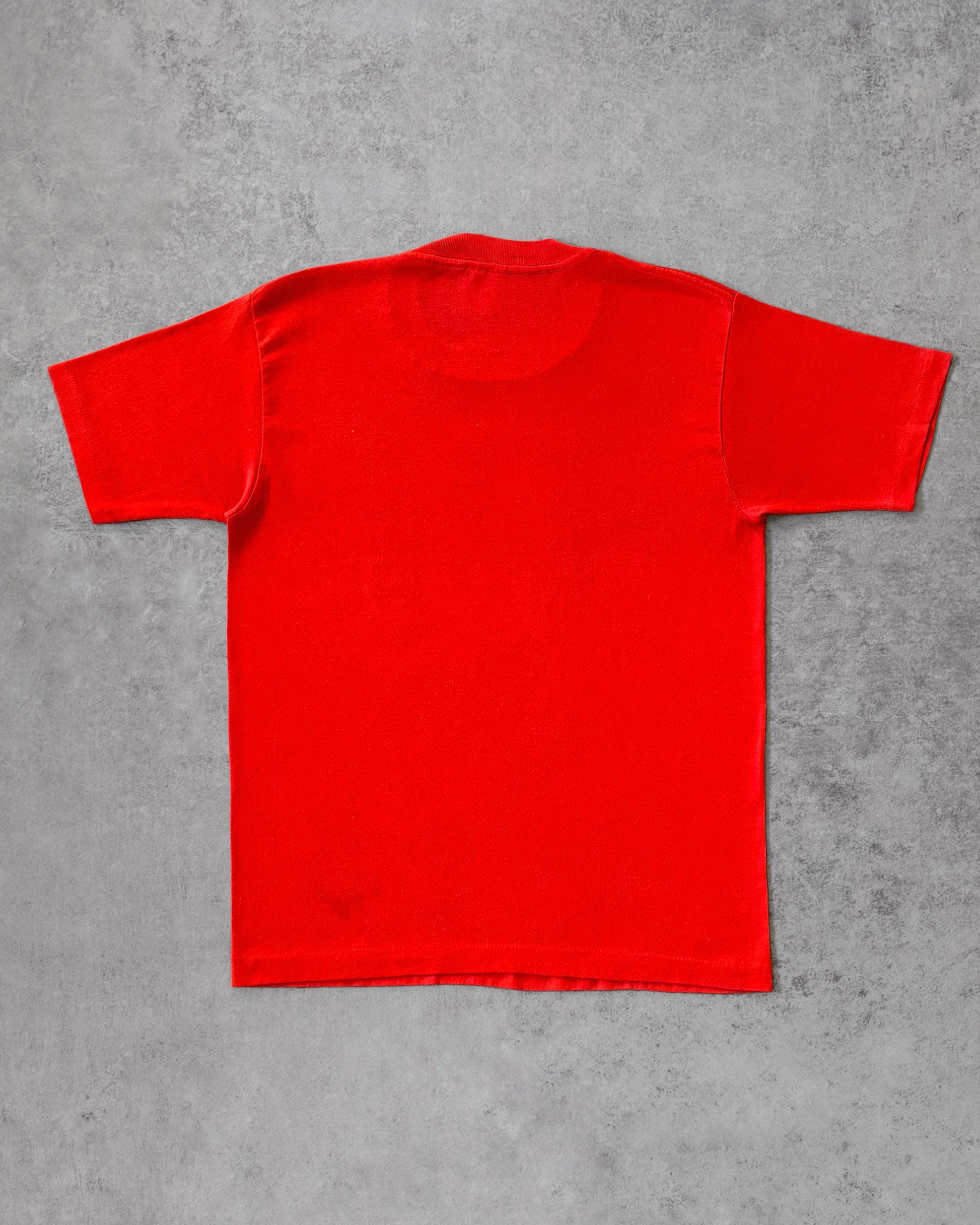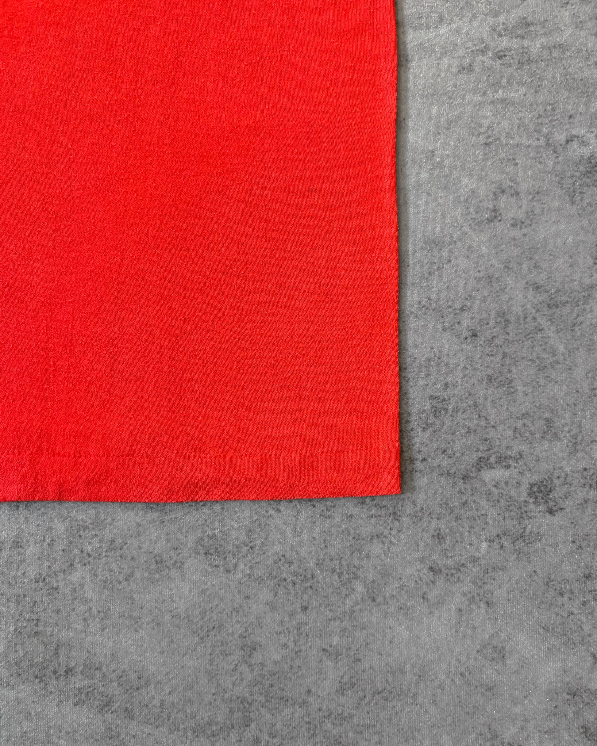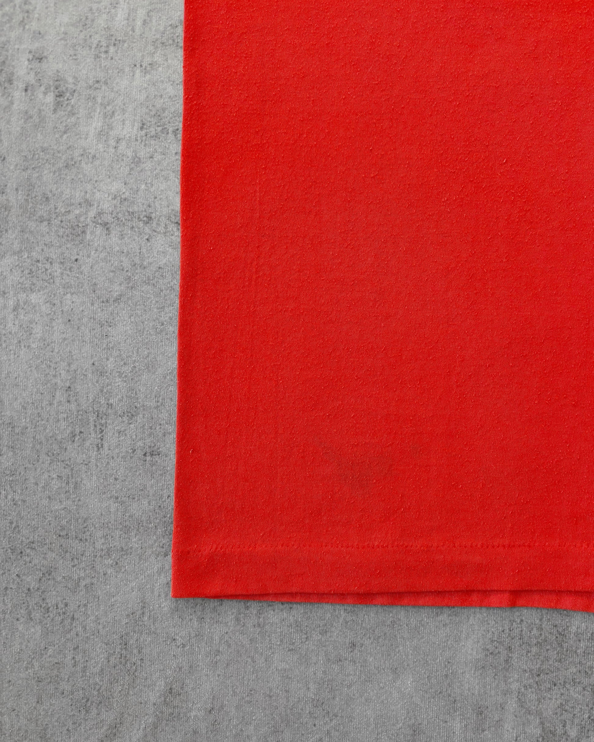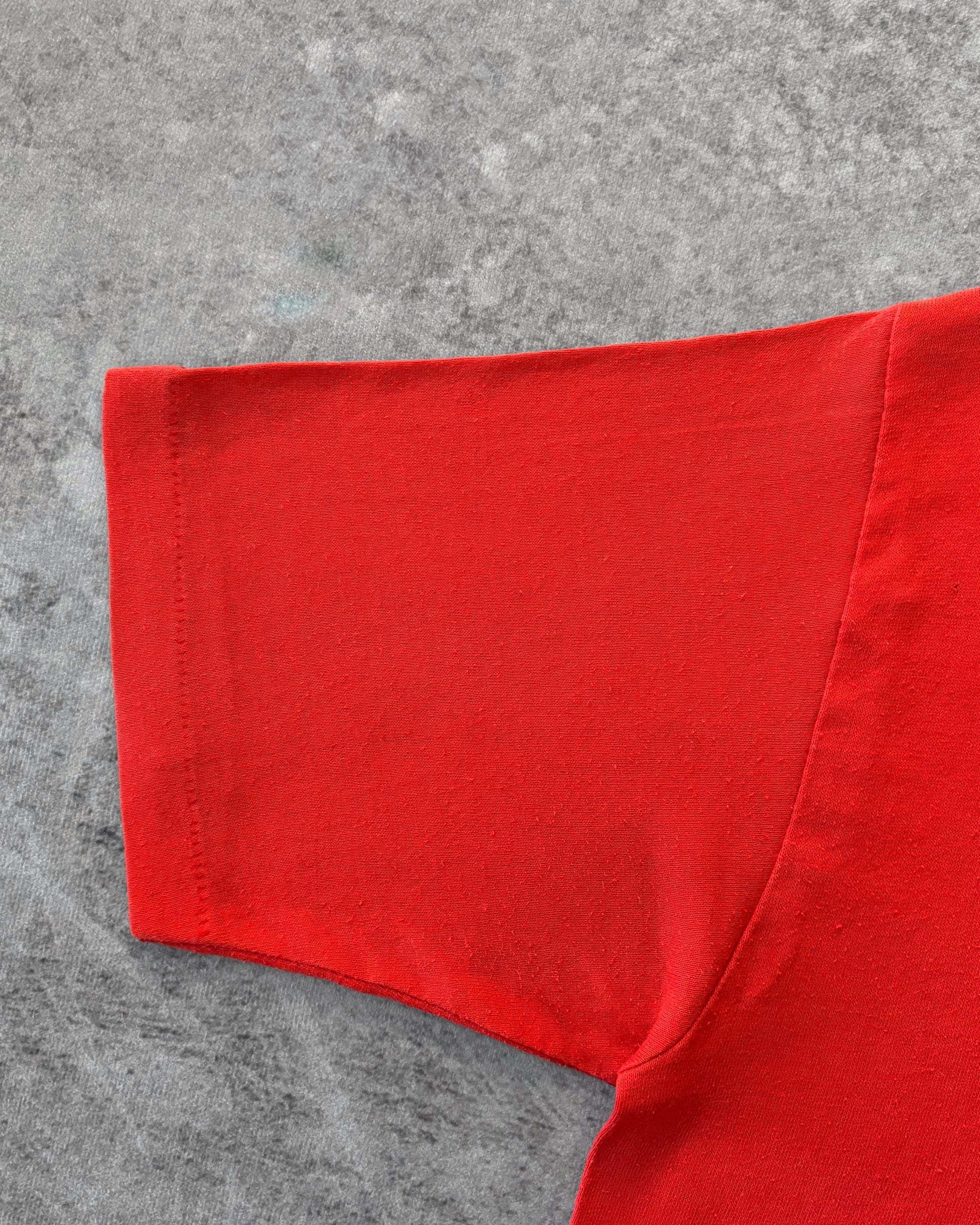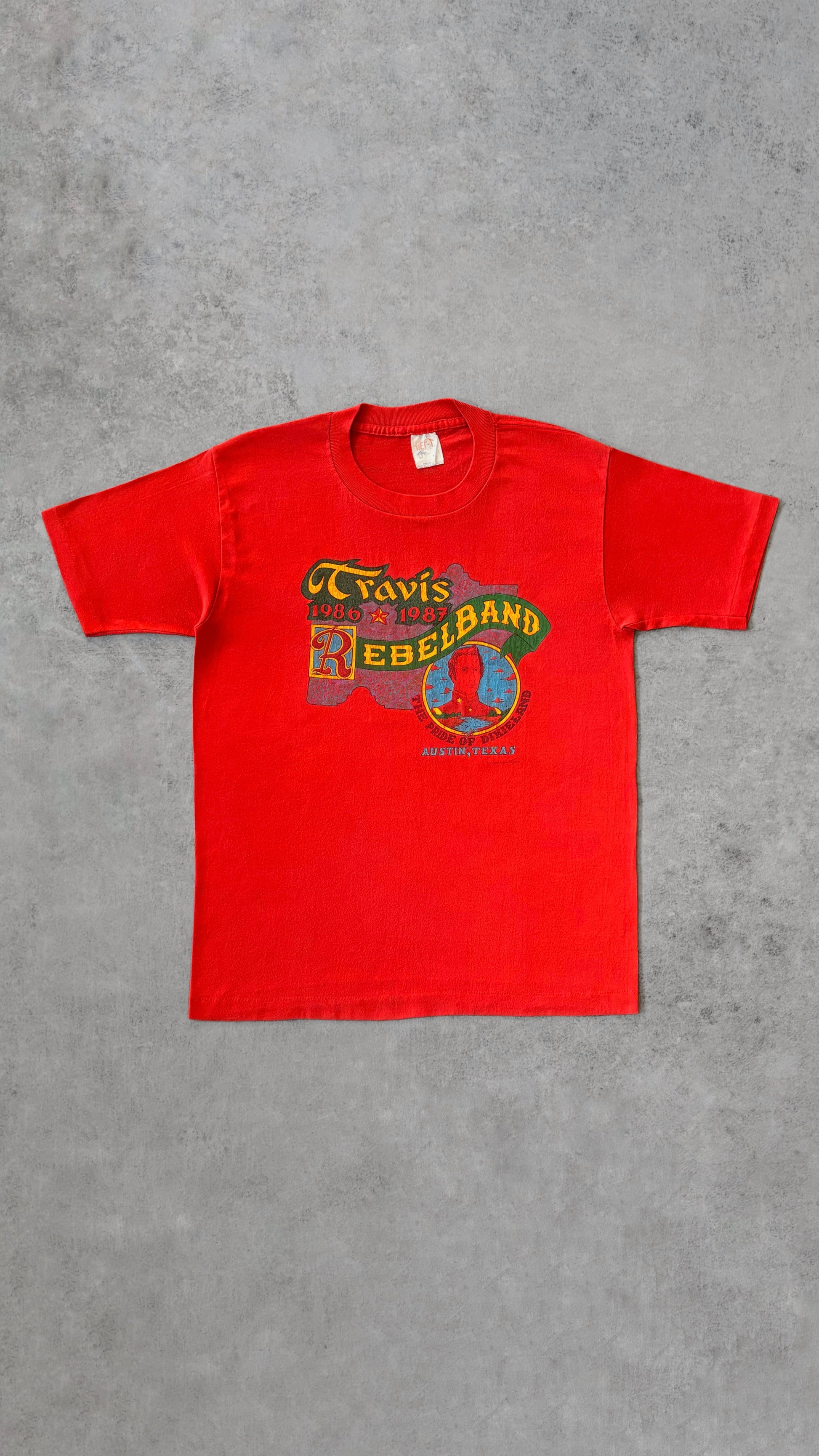 Vintage 1986–1987 Travis Rebel Band T-shirt from Austin, Texas. Strong Southern varsity vibes with a colorful band crest printed on a vibrant red single-stitch tee. Features the Texas state outline, a vintage portrait-style illustration, and the slogan “The Pride of Dixieland.” Printed on a soft 50/50 cotton-polyester Hef T by Tee Jays. Classic '80s fit with single-stitch construction, made in the USA.