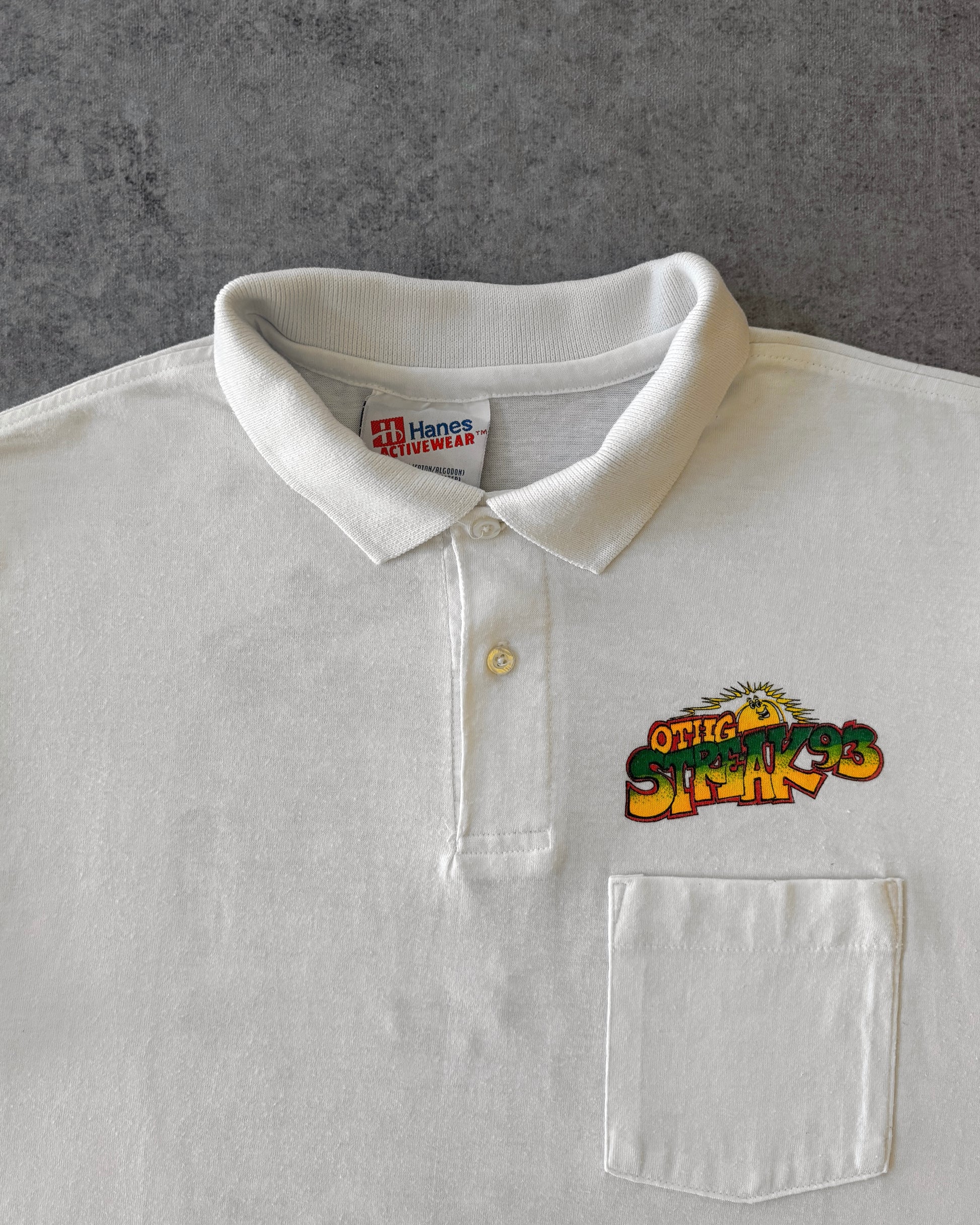 Original 1993 OTHG Streak polo shirt, celebrating the 20th anniversary of the legendary hot rod rally. It features a colorful logo print on the chest and a large cartoon-style graphic on the back featuring hot rods, Coors branding, and the event slogan.