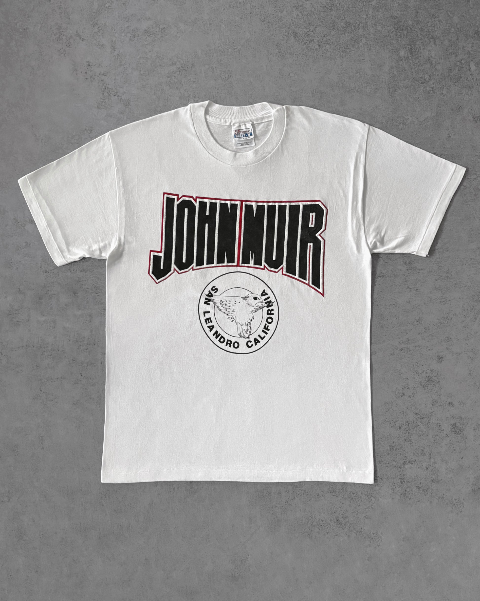 Vintage 1990s John Muir T-shirt featuring bold collegiate lettering and a San Leandro, California, eagle crest graphic. Contrasting black print with red trim on a clean white base.
