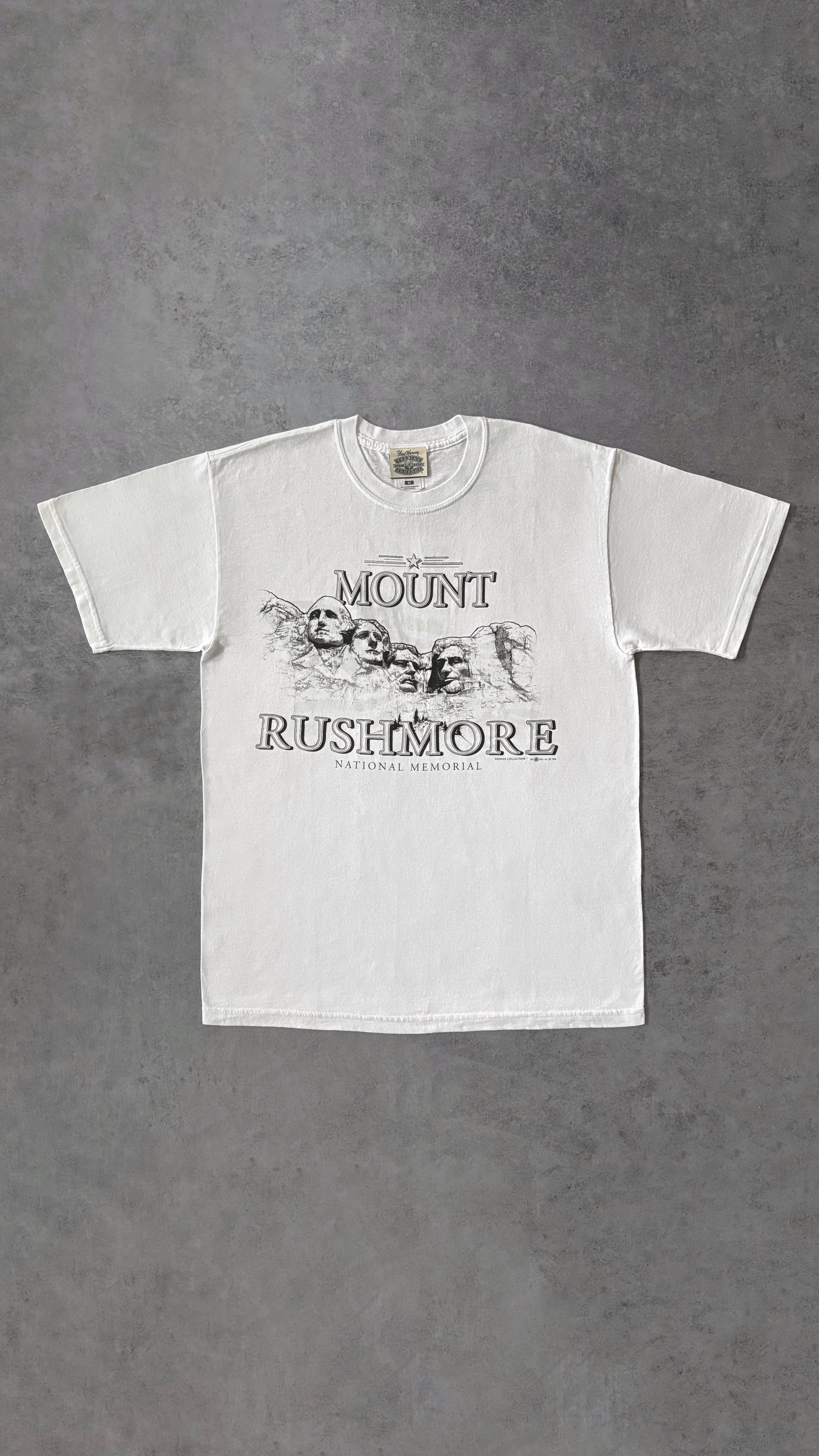 Vintage 1999 travel T-shirt featuring a detailed, sketch-style graphic of Mount Rushmore, depicting the famous monument in bold black lines. Below the presidential sculpture, serif typography reads "Mount Rushmore National Memorial."