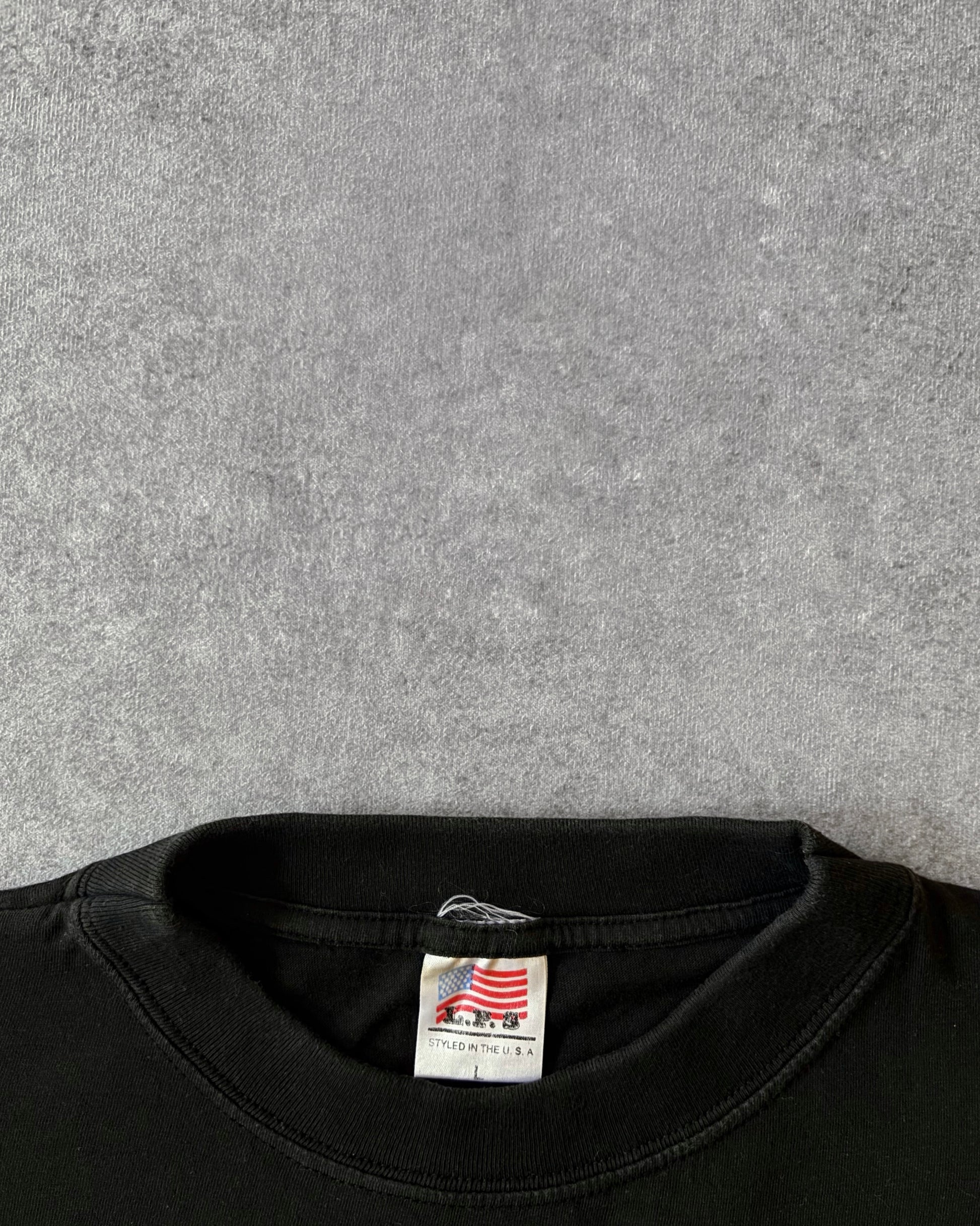Printed on a deep black t-shirt, Made in USA, with thick but soft-touch fabric.
