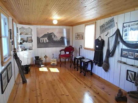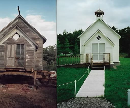 Felpa vintage degli anni ’80, caratterizzata dalla stampa Madeline Island Historical Preservation – Lakeview School (1905–1938) in blu navy su una vivace base rossa.