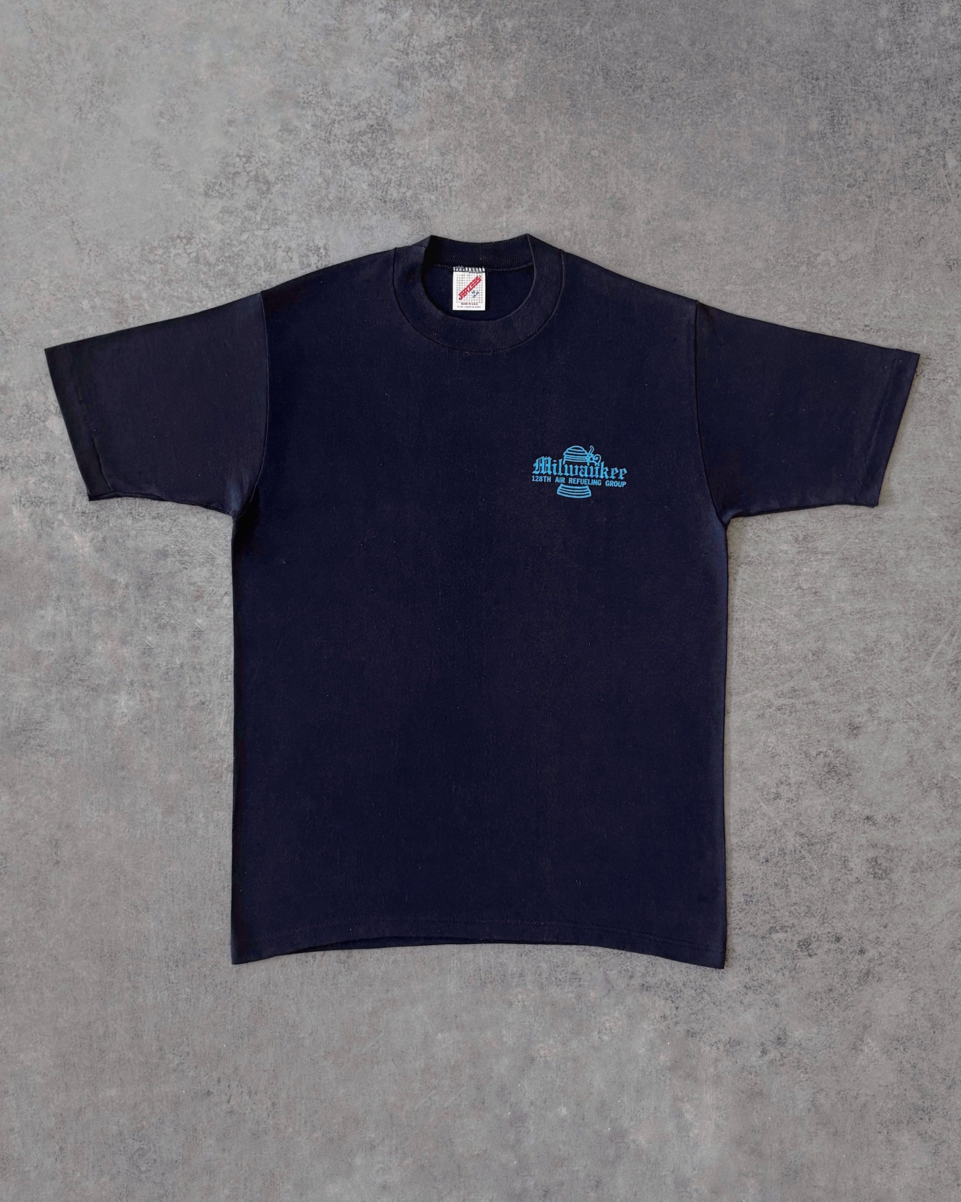 Maglietta vintage anni ’80 U.S. Air Force con grafica futuristica del KC-135E Stratotanker, affiancato da jet stealth che volano sopra un orizzonte a griglia neon. Sul retro spicca la scritta “KC-135E Stratotanker”, mentre sul petto si legge “Milwaukee 128th Air Refueling Group” con un disegno di boccale di birra, richiamo all’orgoglio dello squadrone locale.