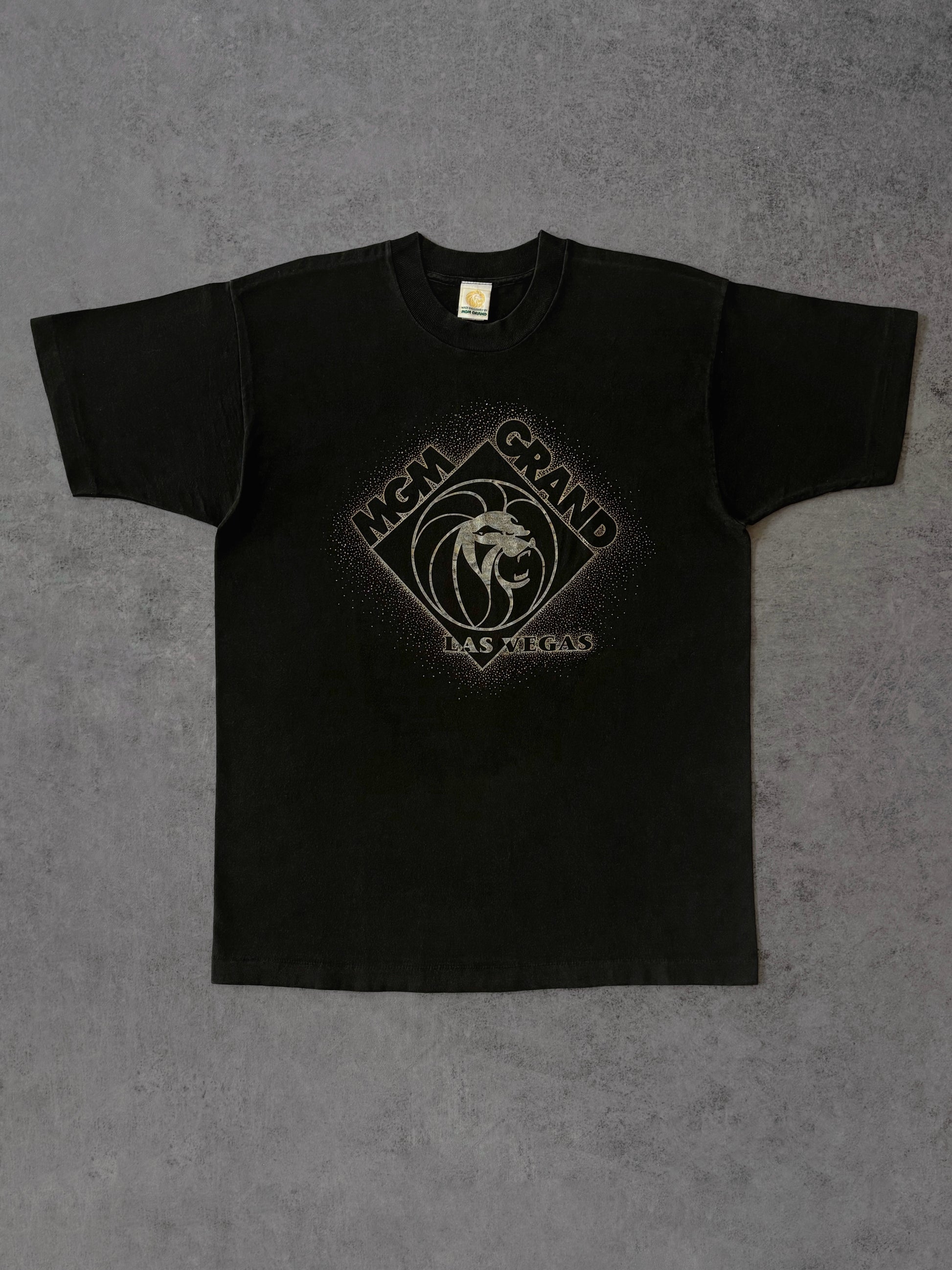 T-shirt souvenir dei primi anni ’90 dell’MGM Grand Las Vegas, con il classico emblema del leone ruggente inserito in un motivo a diamante.