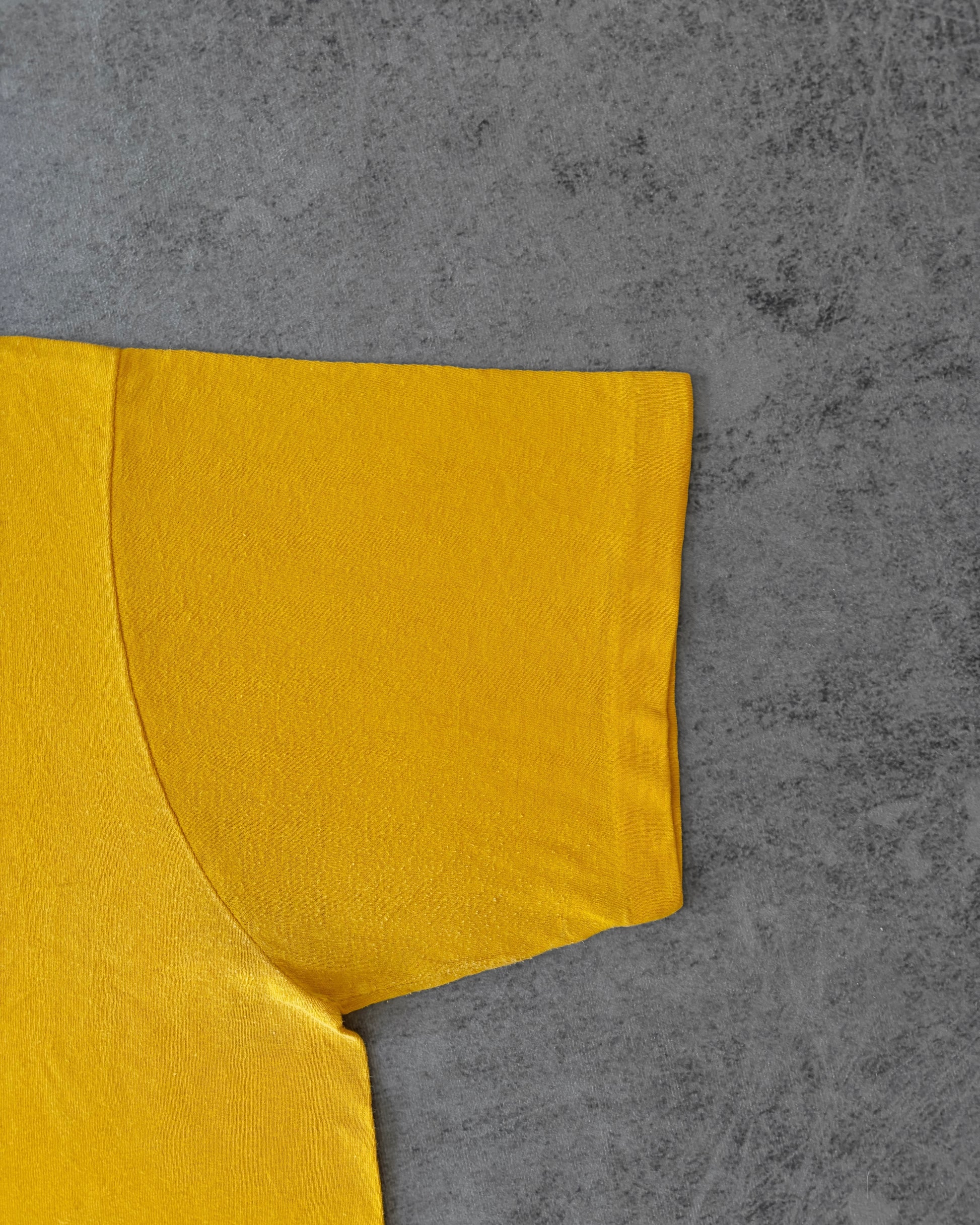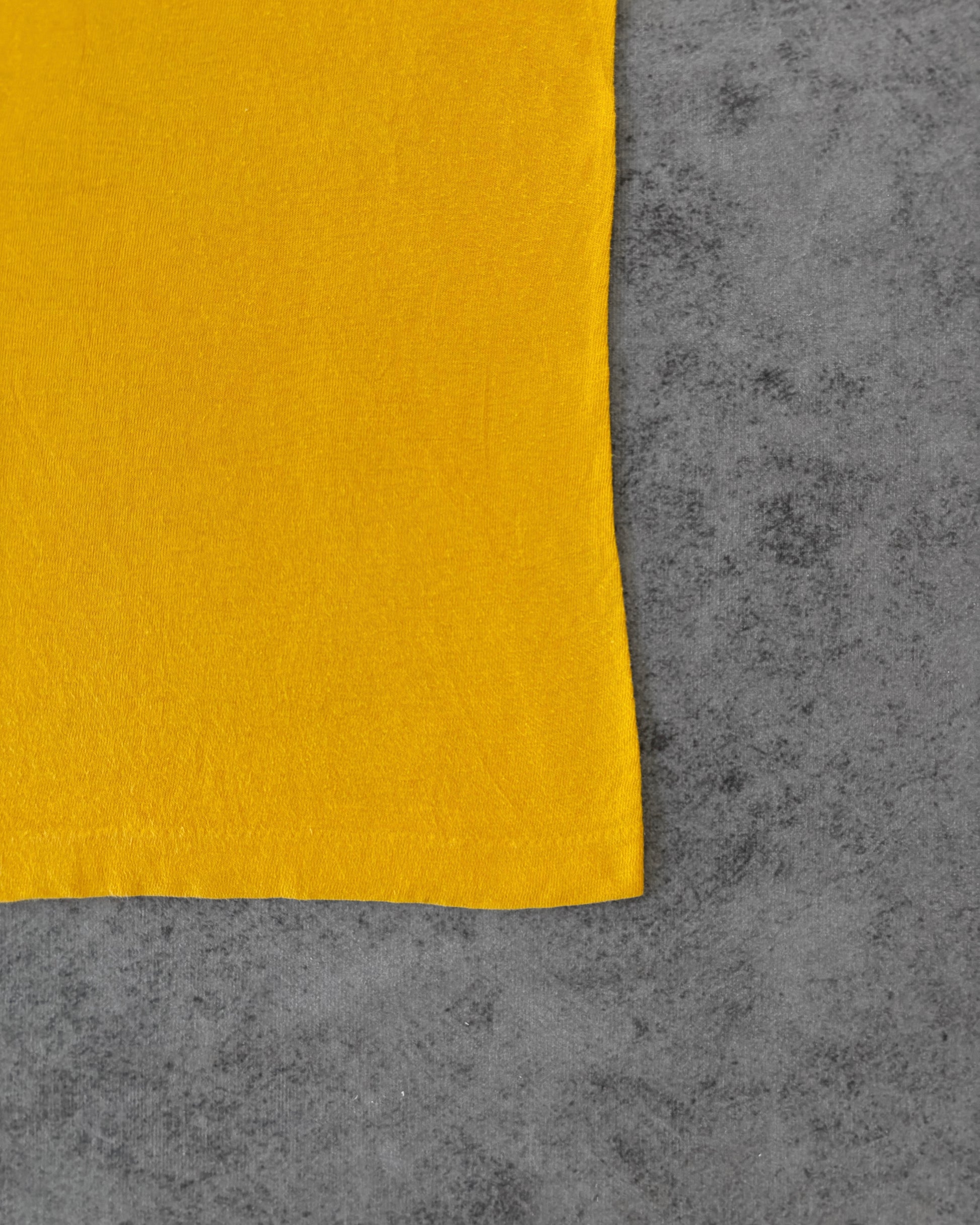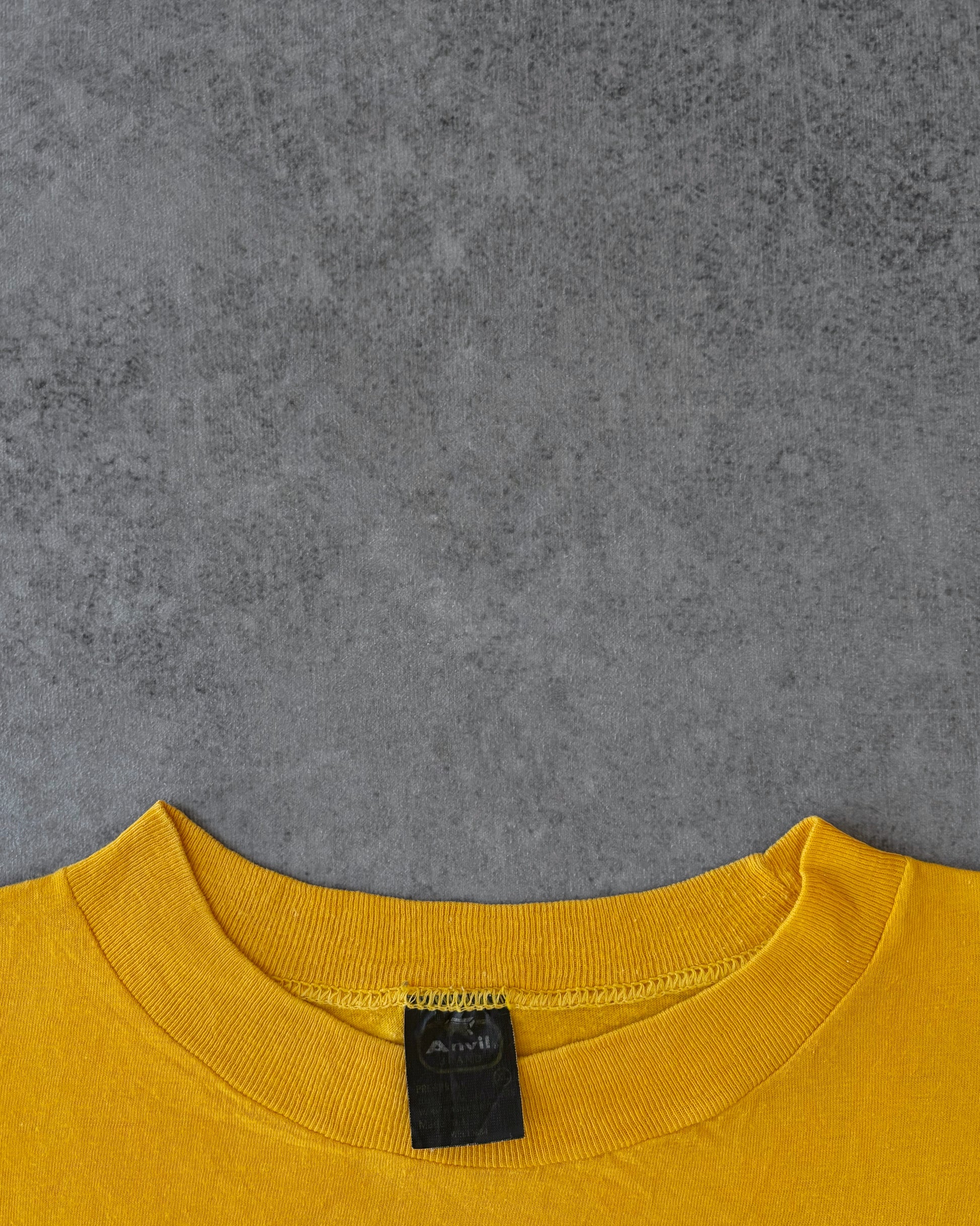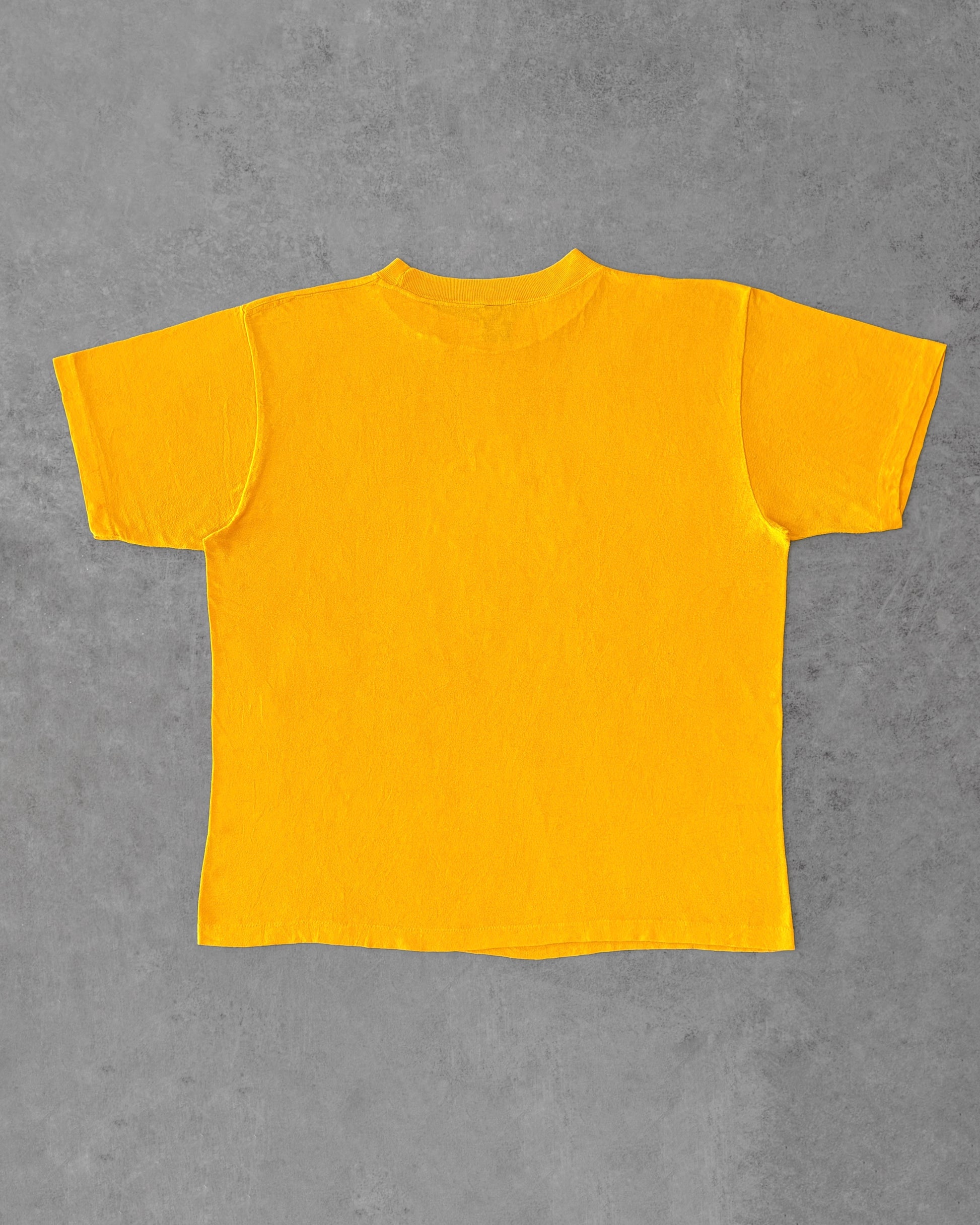 Stampata su T-shirt gialla Anvil con la rara etichetta nera (era metà anni ’70/inizio ’80), con costruzione single stitch.