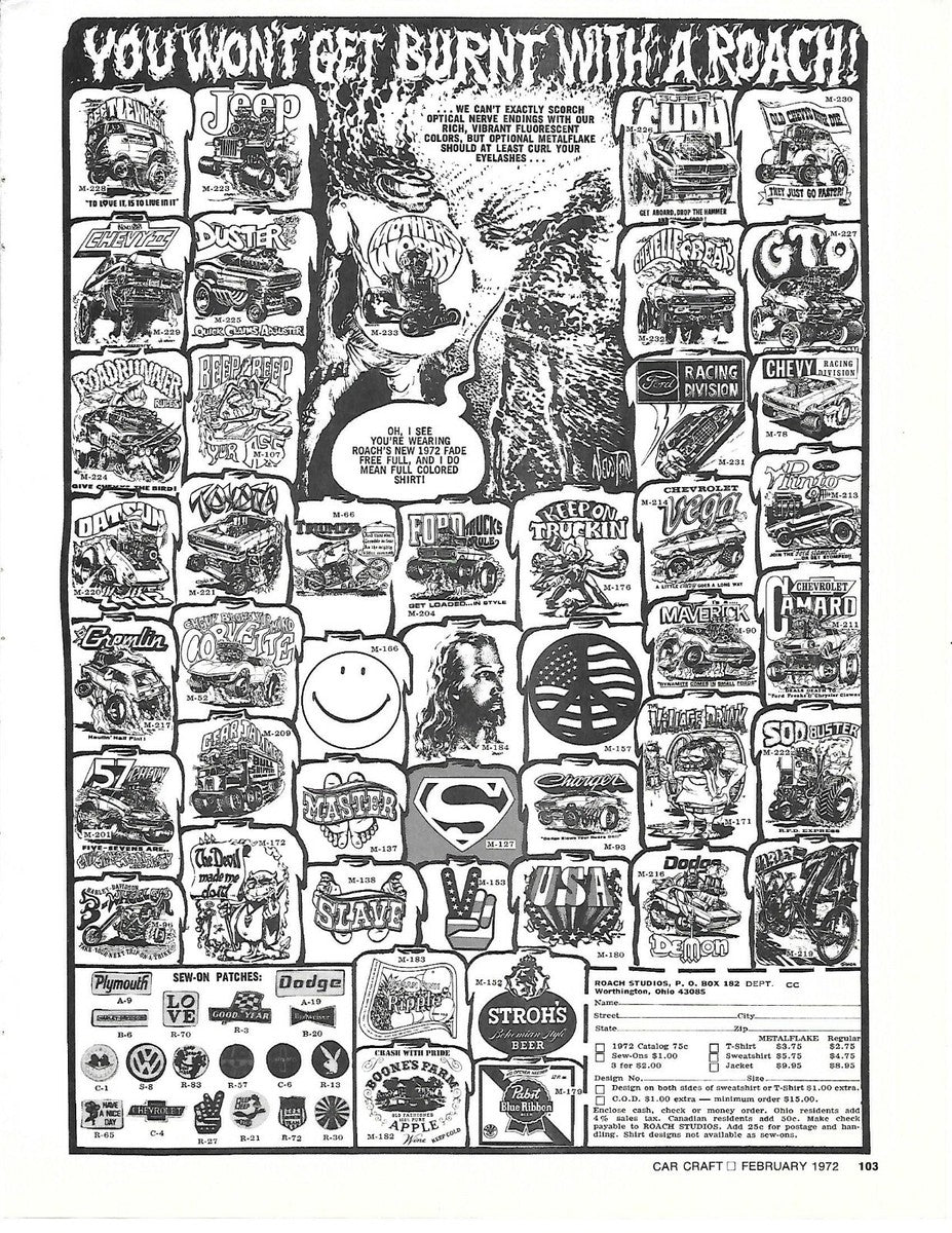 Nel 1962, due fratelli dell’Ohio iniziarono ad aerografare artwork di hot rod sulle T-shirt, ispirati alle leggende californiane come Ed “Big Daddy” Roth. La loro piccola attività, Roach Studios, ebbe un’esplosione di successo quando, alla fine degli anni ’60, adottarono una nuova tecnologia: le transfer iron-on. Per la prima volta, chiunque poteva acquistare un disegno audace per corrispondenza, stamparlo con un semplice ferro da stiro e trasformare una maglietta anonima in un capo d’arte da indossare.