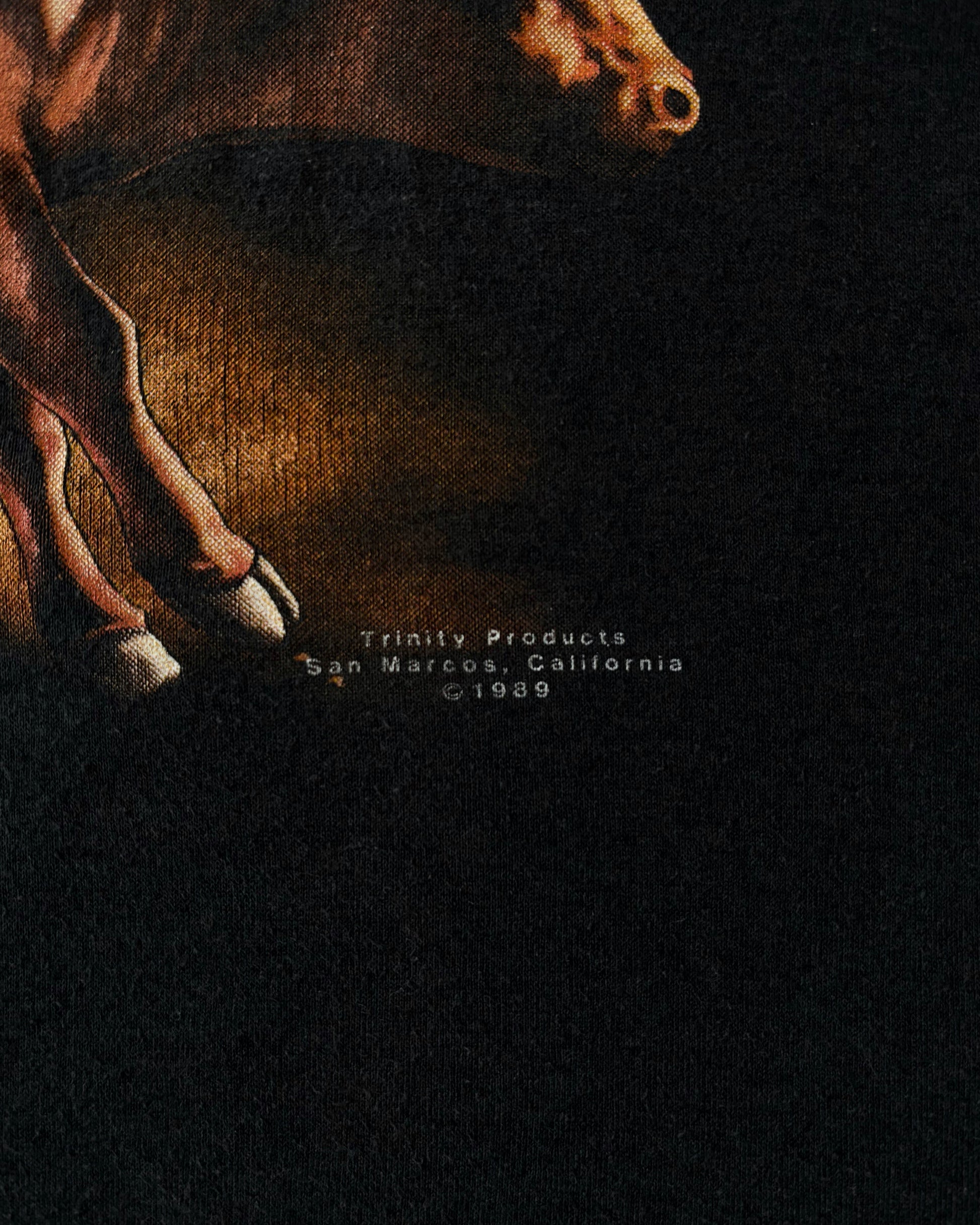 Maglietta vintage “American Cowboy” del 1989 prodotta da 3D Emblem, con illustrazione sotto copyright Trinity Products, San Marcos, California (1989). Presenta una dettagliata stampa in mezzatinta raffigurante un cowboy su toro avvolto nella bandiera americana, resa con toni caldi, movimento dinamico e texture esplosiva.