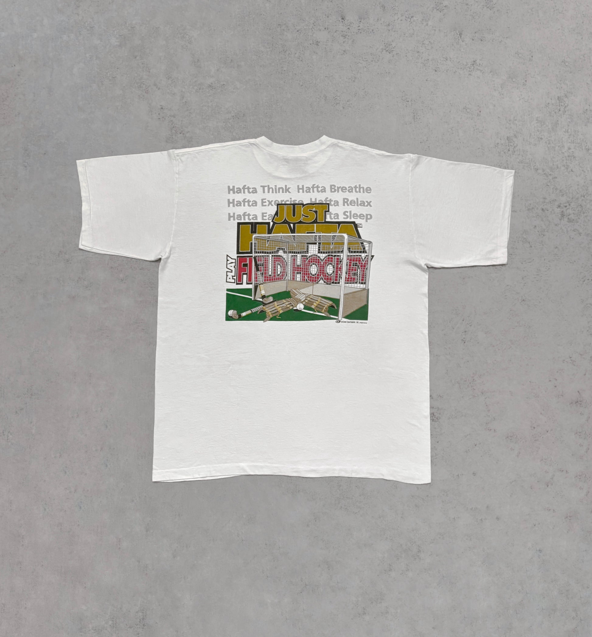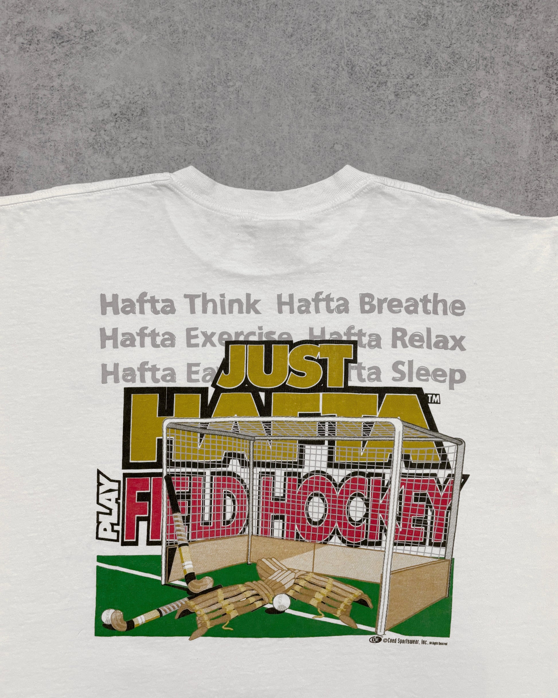 Maglietta vintage Just Hafta Field Hockey con stampa su T-shirt Coed Sportswear con etichetta. Made in USA 🪴