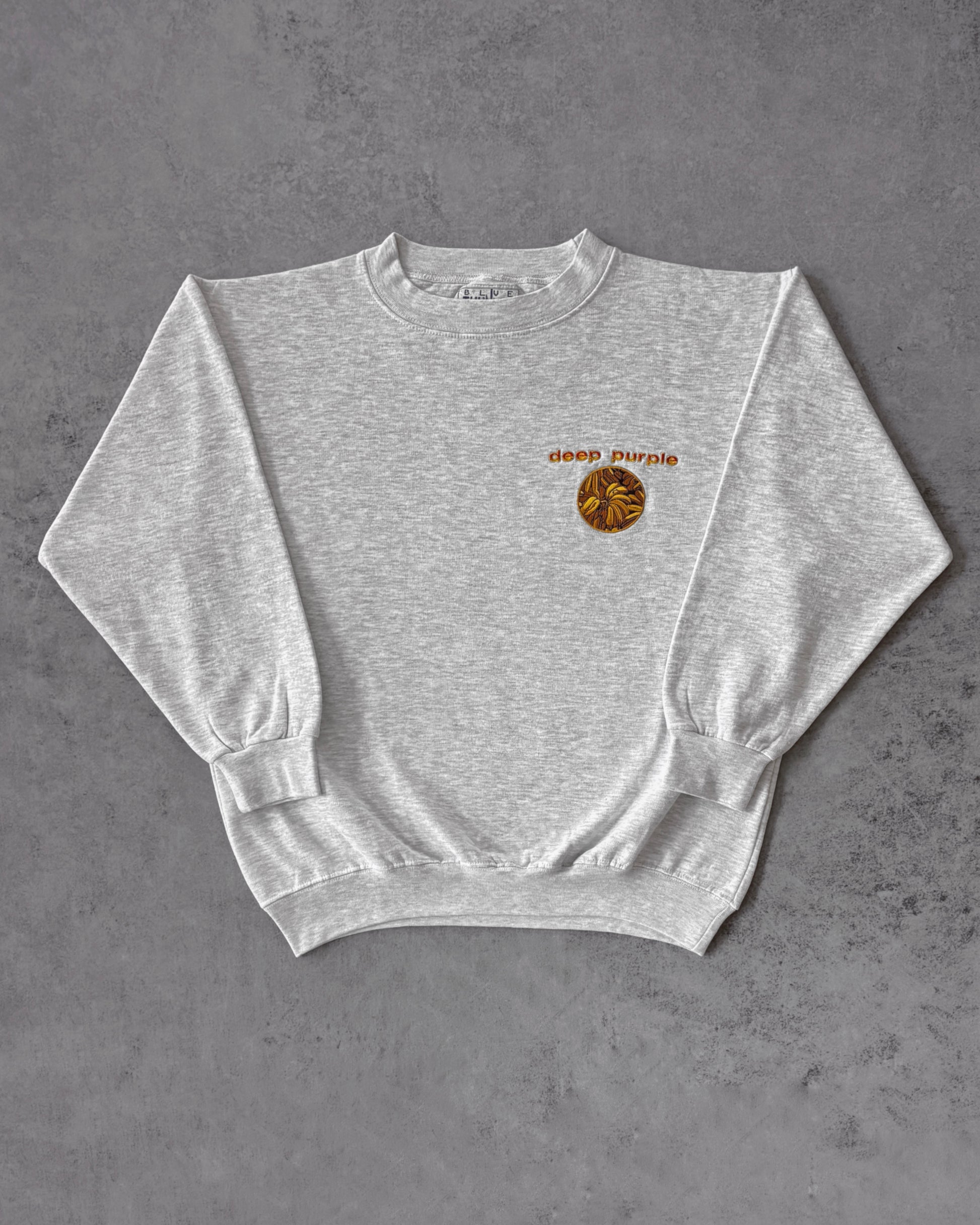 Felpa vintage Deep Purple del 2003, realizzata per l’album Bananas. Presenta un piccolo logo ricamato sul petto nei toni dell’arancione e dell’oro, con un motivo a banana stilizzato, ispirato alla grafica e alle visual del tour dell’album.