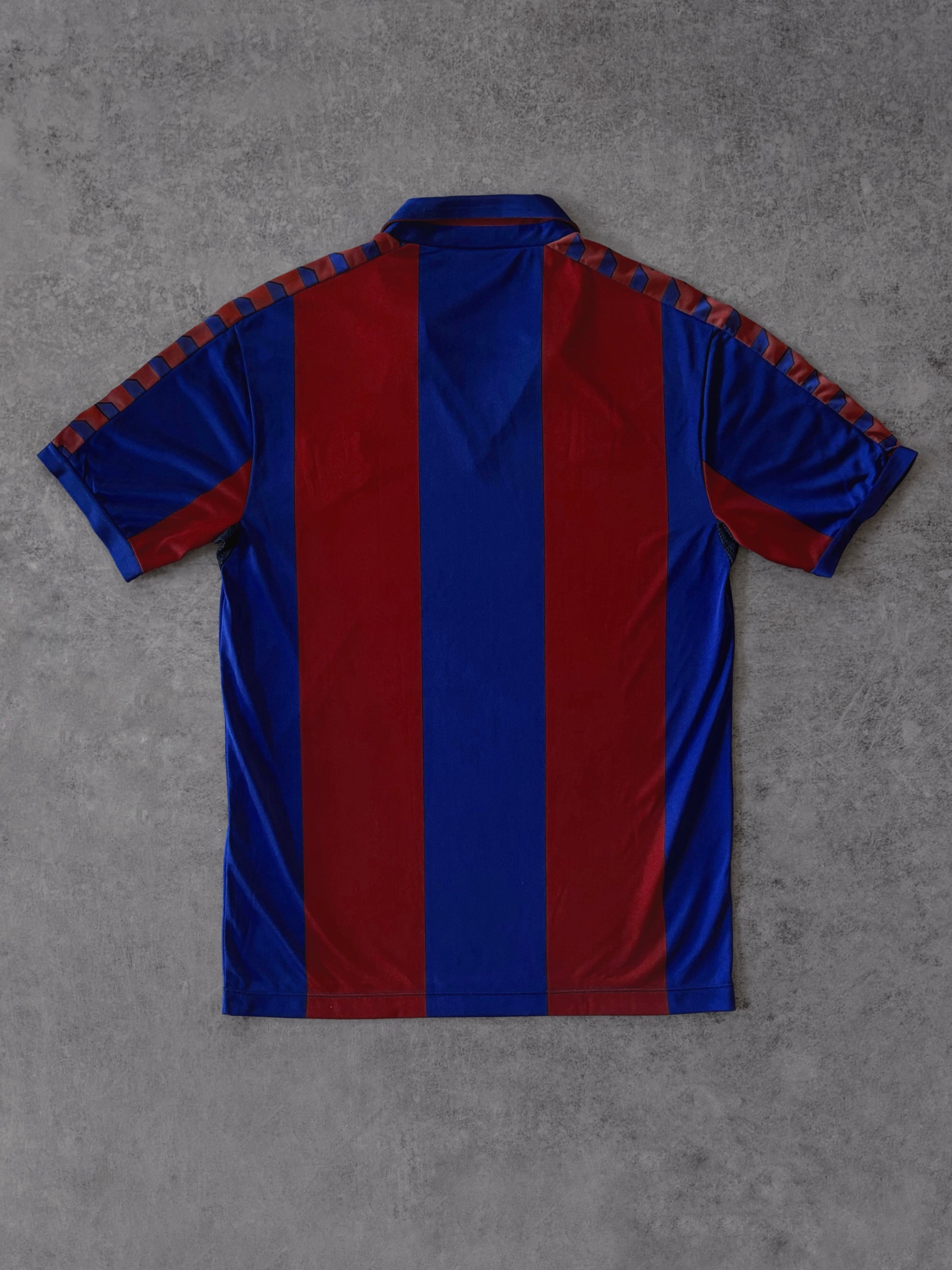 Maglia autentica dell’FC Barcelona Meyba home dei primi anni ’80, caratterizzata dalle iconiche larghe strisce blaugrana e dal logo Meyba e lo stemma ricamato classico utilizzato nell’era Maradona/Schuster.