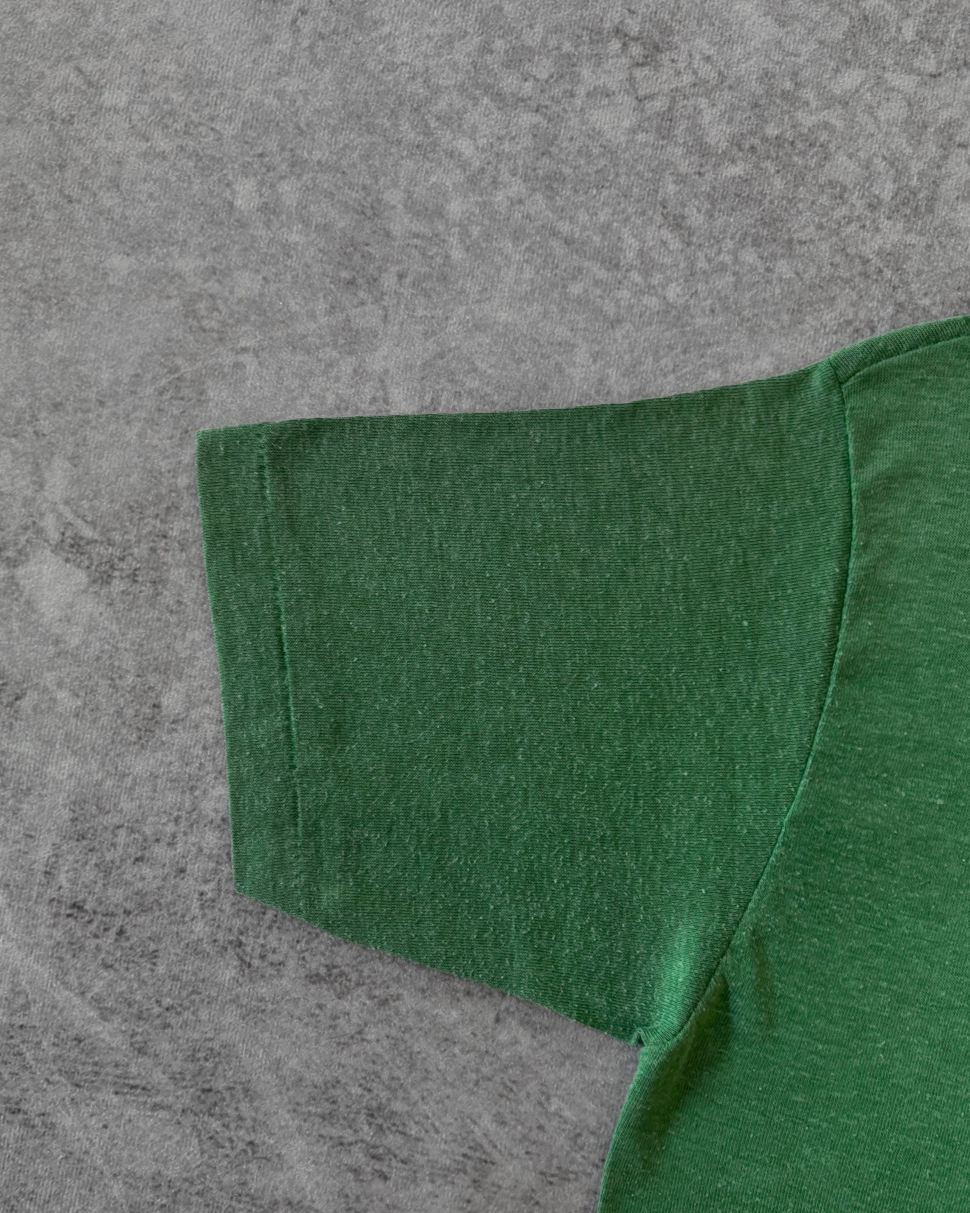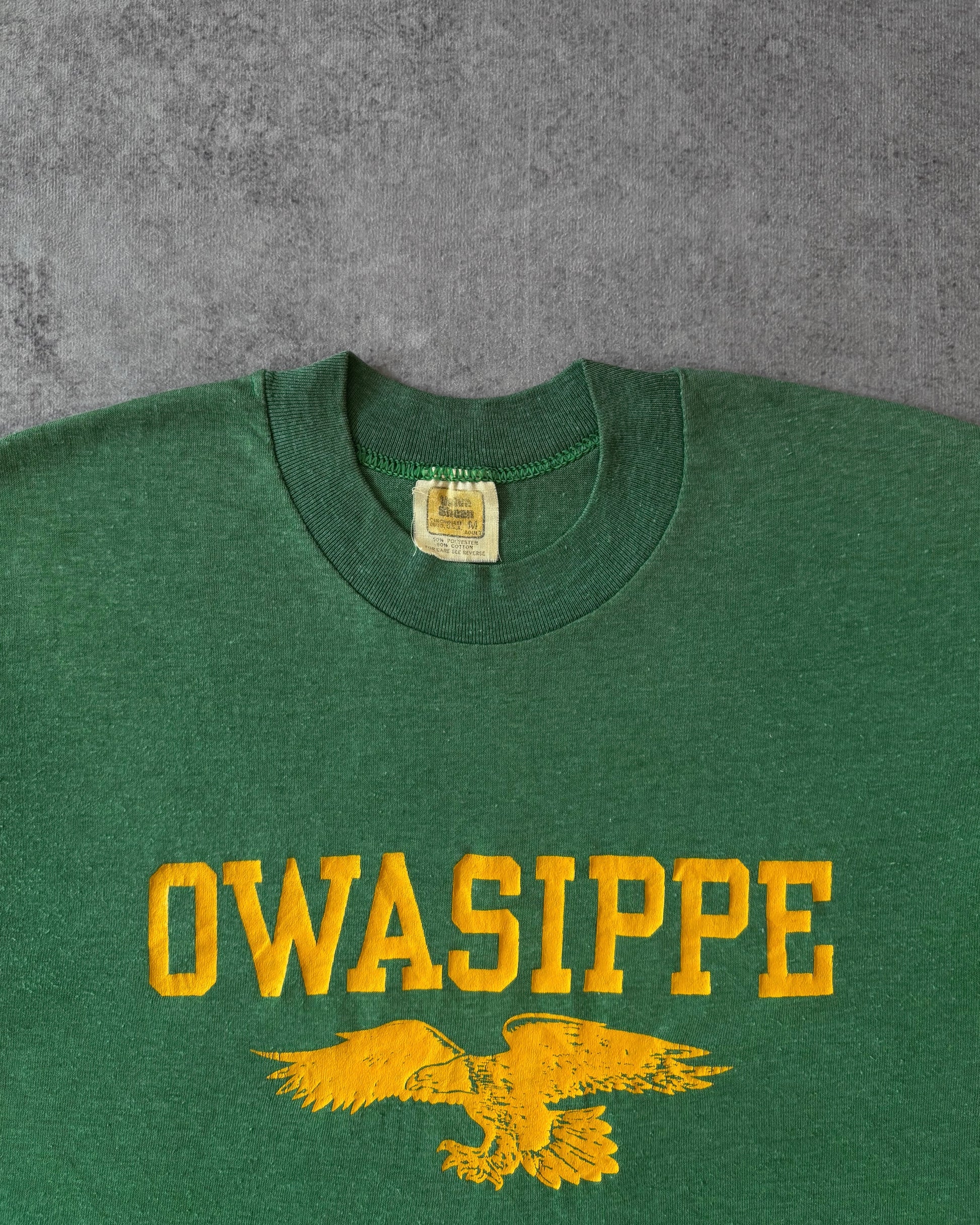 Maglietta vintage anni ’70 dell’Owasippe Scout Camp color verde foresta con stampa di un’aquila dorata. La scritta “OWASIPPE” in stile collegiale campeggia sopra un’aquila in volo.