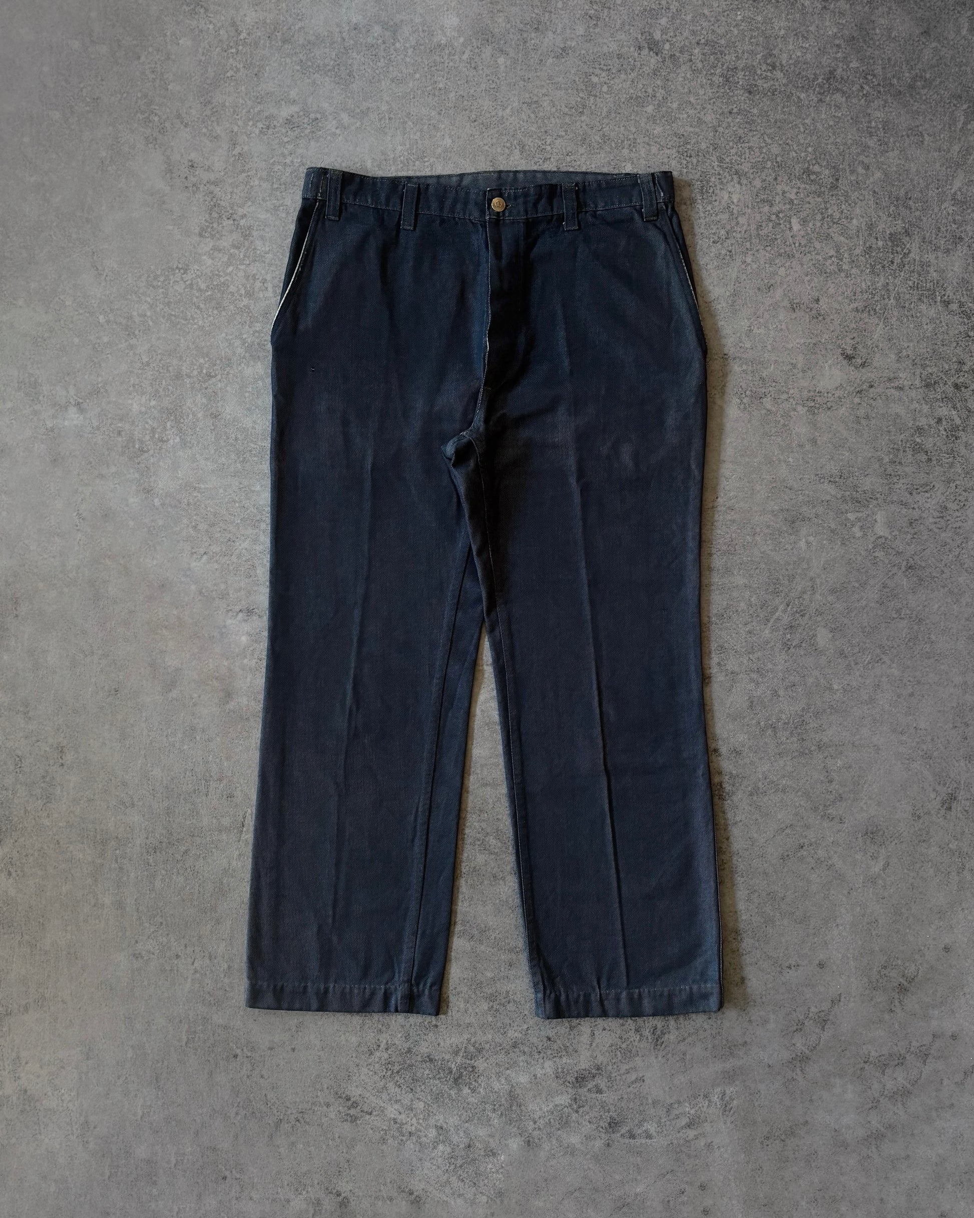 Realizzati in twill di cotone blu, presentano una vestibilità dritta con vita regolare. Chiusura frontale con bottoni e tasca posteriore con zip Éclair, dettaglio tipico della manifattura europea dell’epoca.