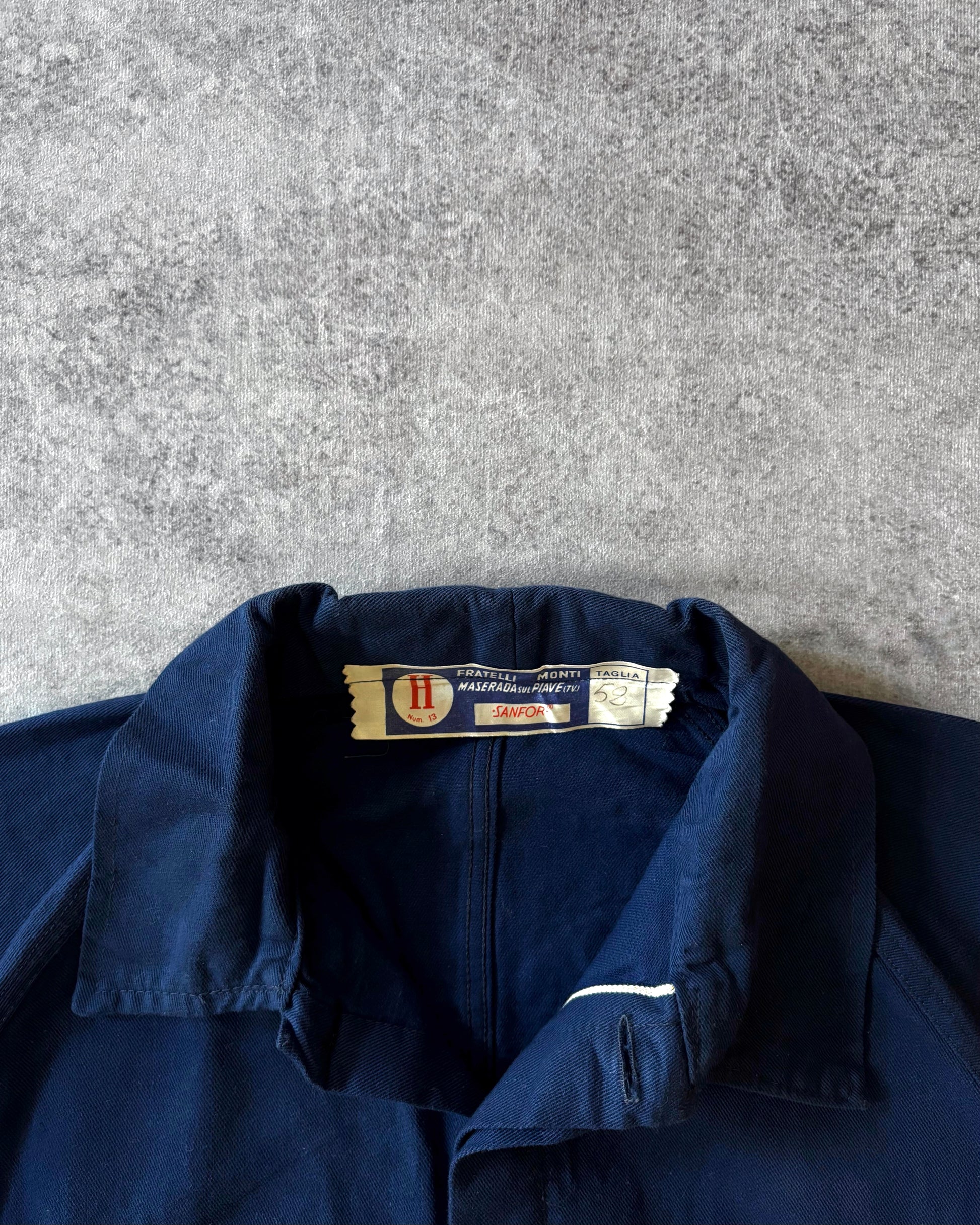 Vintage giacca da lavoro in denim italiana degli anni ’70, prodotta da Fratelli Monti.