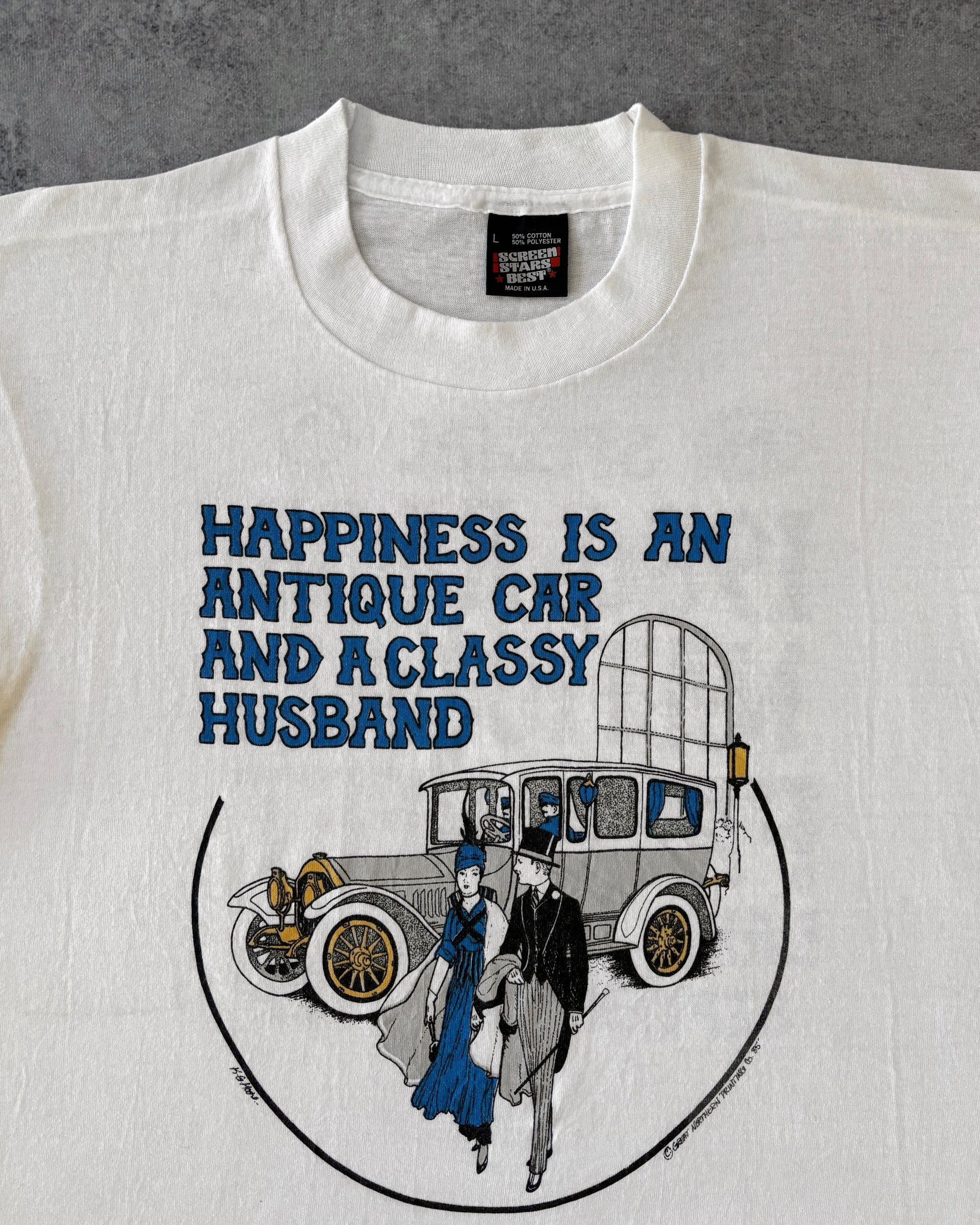Maglietta vintage 1986 AACA (Antique Automobile Club of America) National Fall Meet, tenutosi a Lake Placid, NY. Sul fronte presenta un’illustrazione d’epoca con lo slogan “Happiness is an Antique Car and a Classy Husband”. Sul retro, i dettagli dell’evento con i loghi ufficiali AACA.