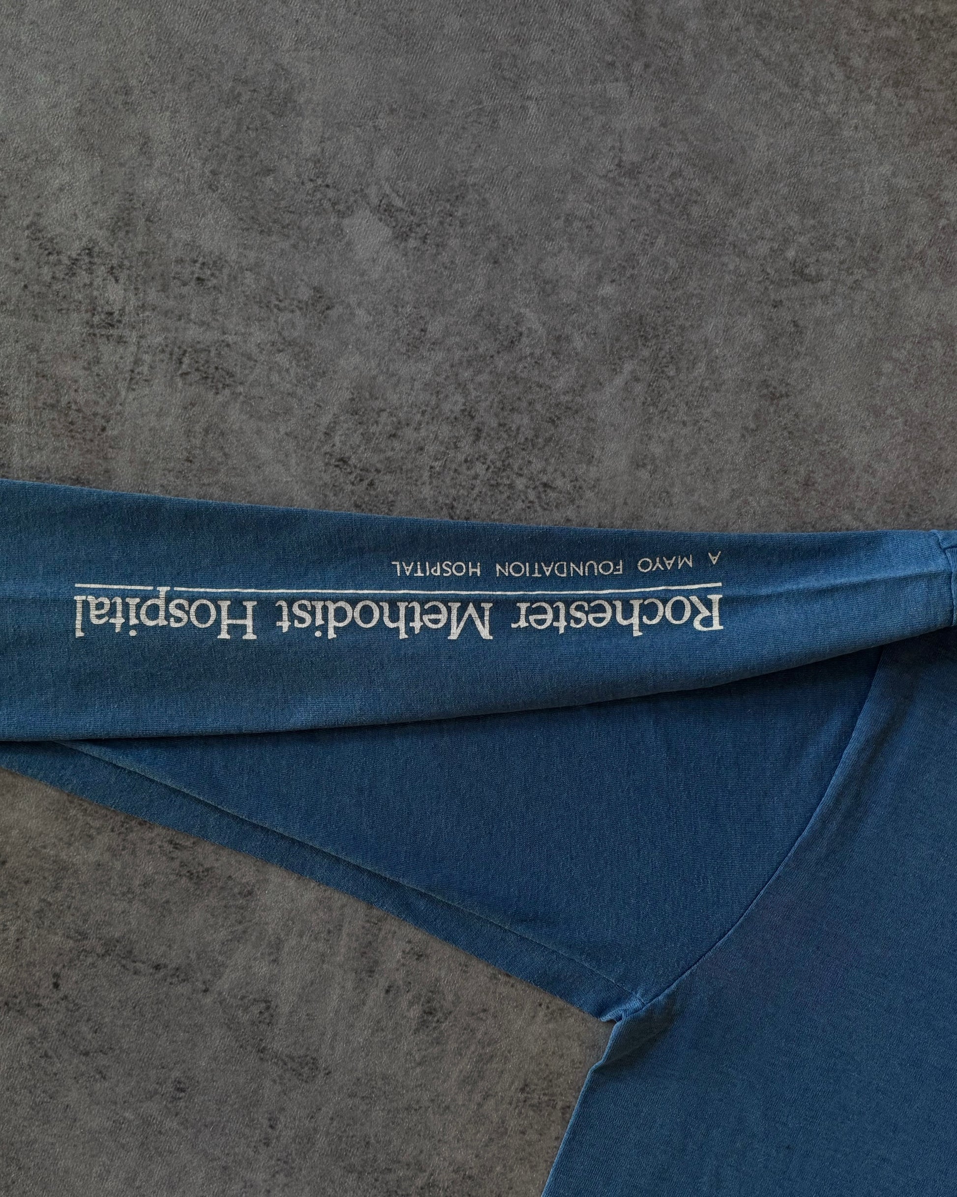 La grafica frontale presenta tre mele rosse abbinate a una tipografia decisa e perfettamente coerente con l’epoca. La manica sinistra riporta la stampa Rochester Methodist Hospital – A Mayo Foundation Hospital, che ancora una volta radica il capo nel suo contesto locale e sanitario.