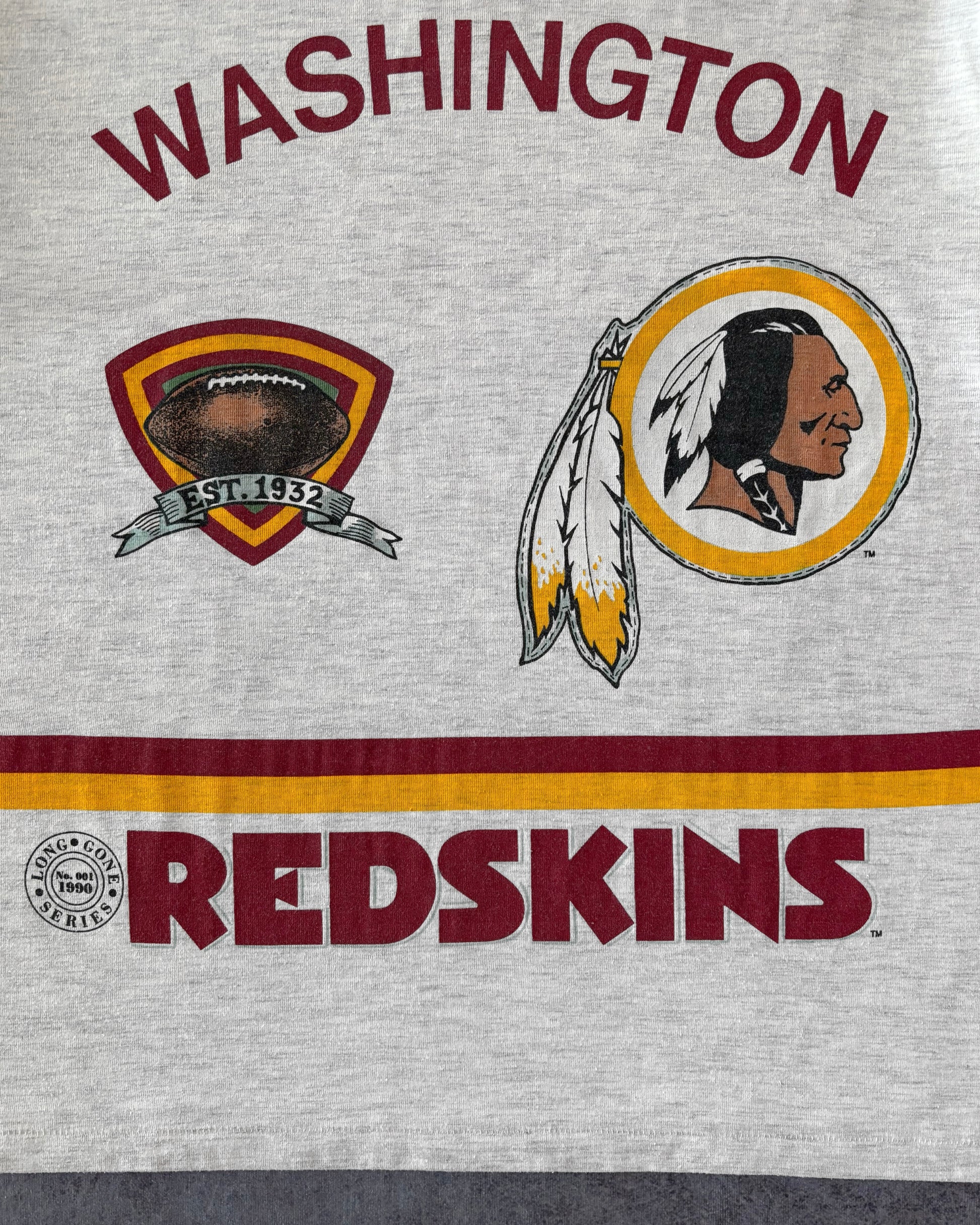 T-shirt Washington Redskins della serie Long Gone del 1990, dedicata all’iconica stagione del campionato NFL del 1942. Stampata su una maglia Long Gone by Garann, Made in USA, realizzata in una morbida miscela 50/50.