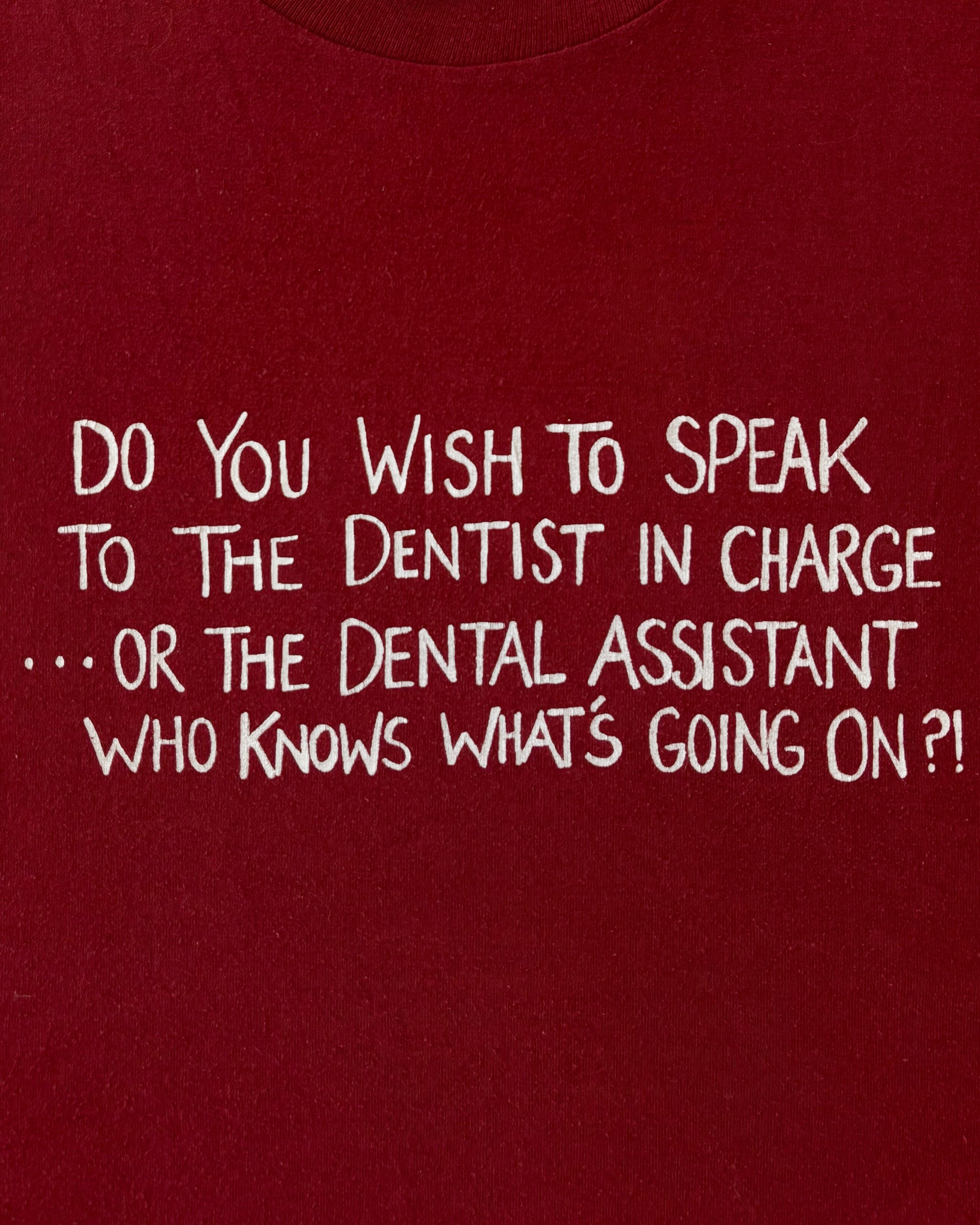 Maglietta vintage “Do You Wish to Talk to the Dentist” stampata su una Hanes anni ’90 con etichetta, single stitch. Made in USA.