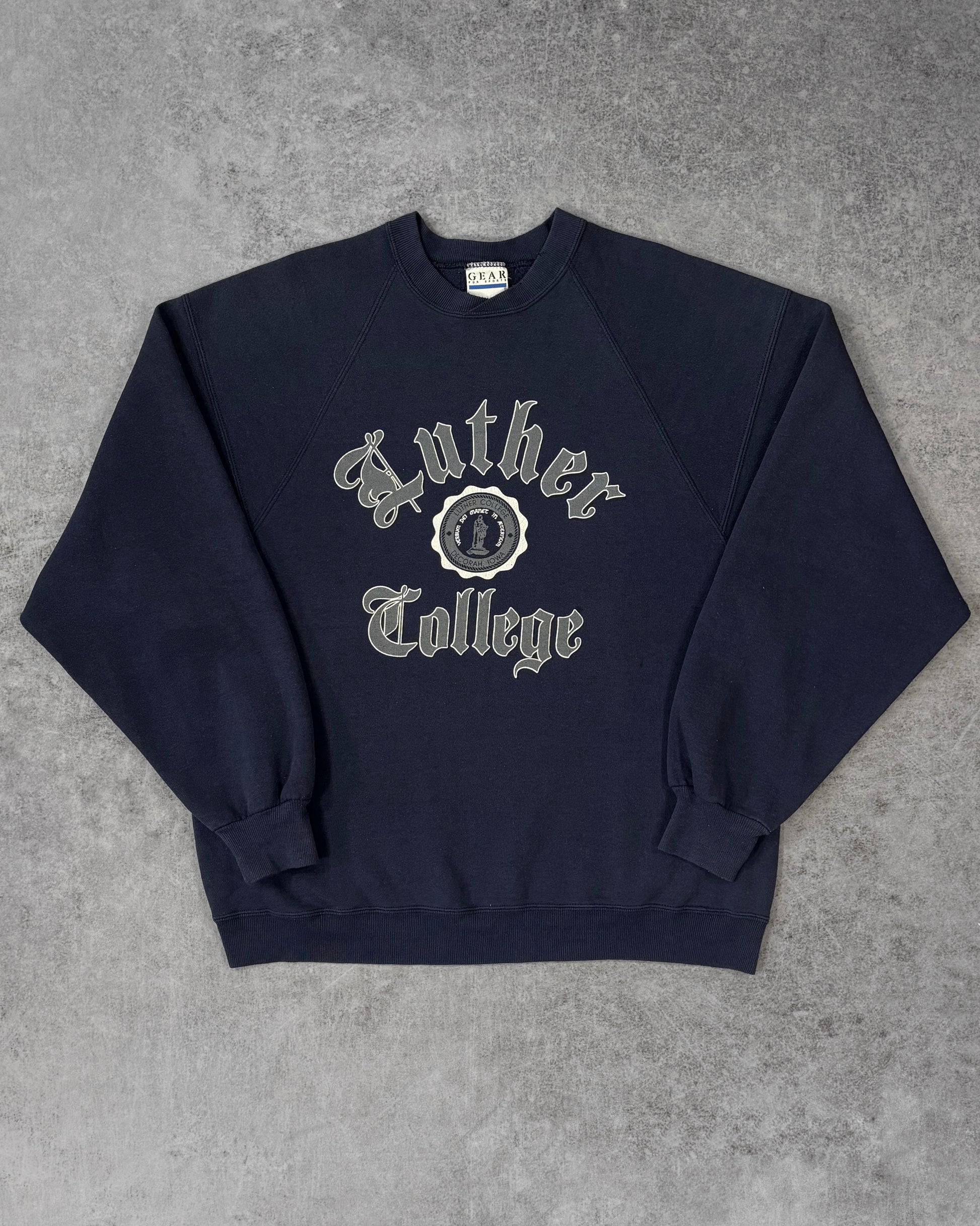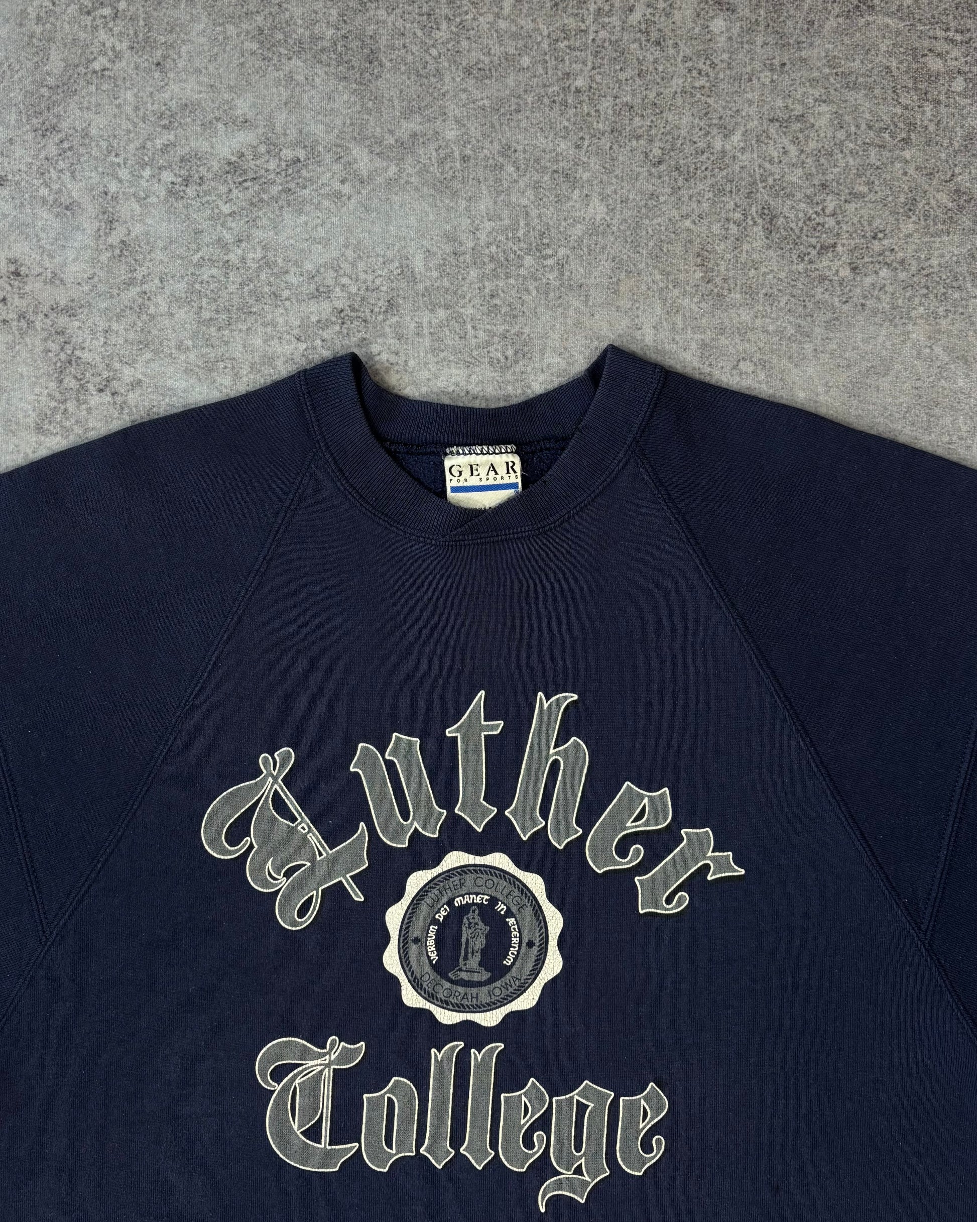 Felpa collegiale vintage Luther College prodotta da Gear for Sports, con grafica caratterizzata da lettering in stile gotico e stemma centrale.