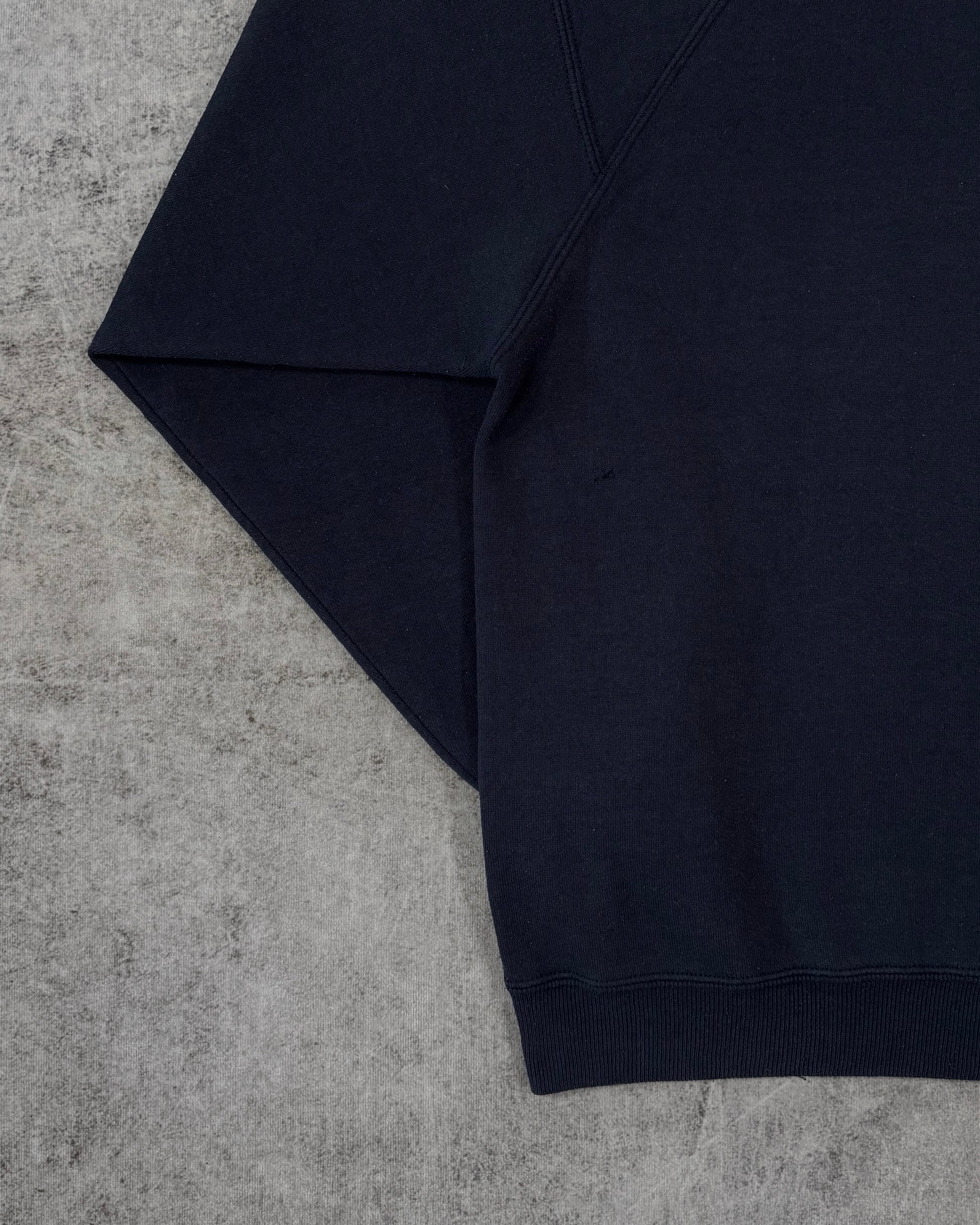 La costruzione presenta maniche raglan e un resistente fleece di peso medio in misto cotone/poliestere, tipico dell’abbigliamento athletic vintage.