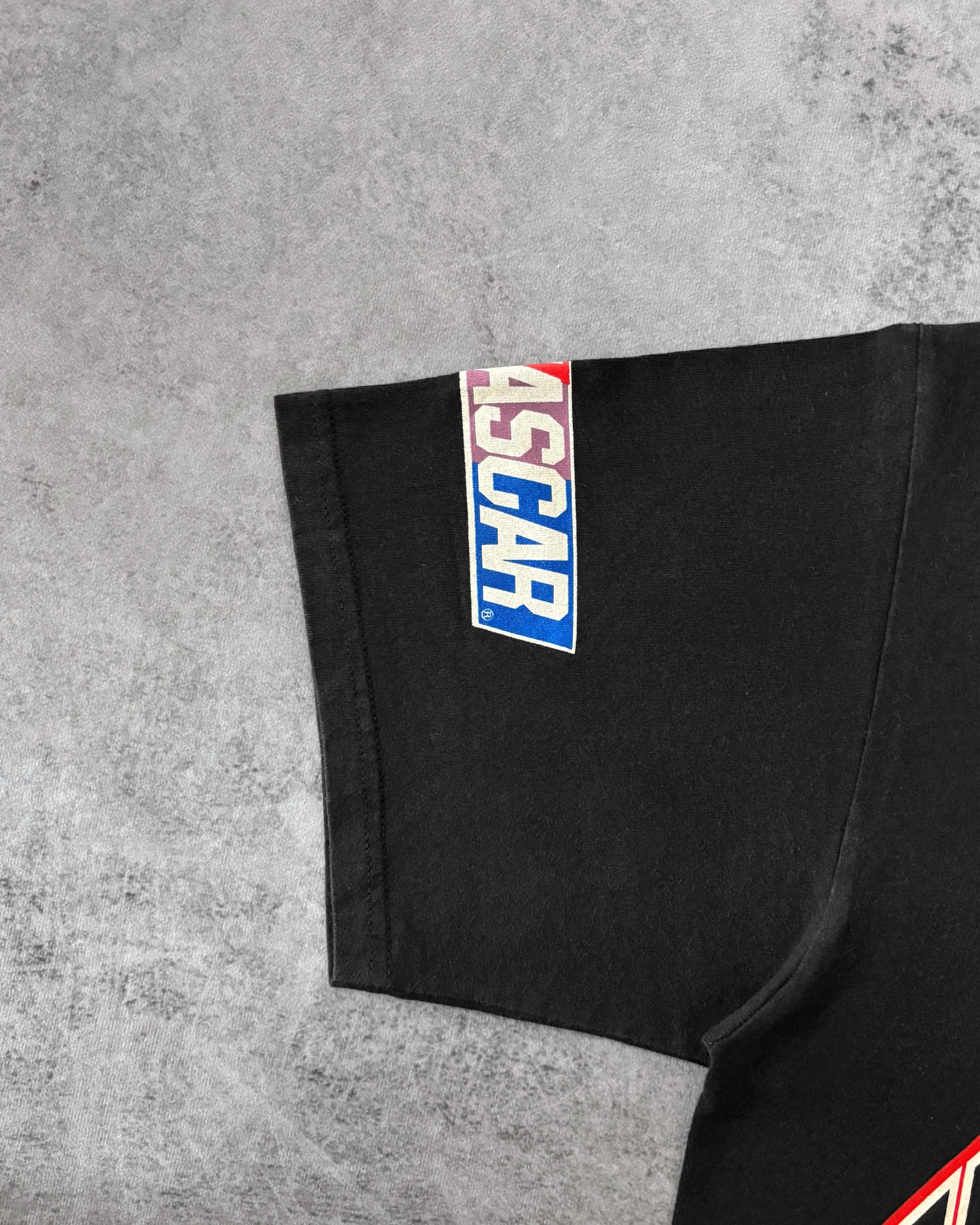 Stampata su base Nutmeg Mills nera, Made in USA. Entrambe le maniche riportano i loghi ufficiali NASCAR.