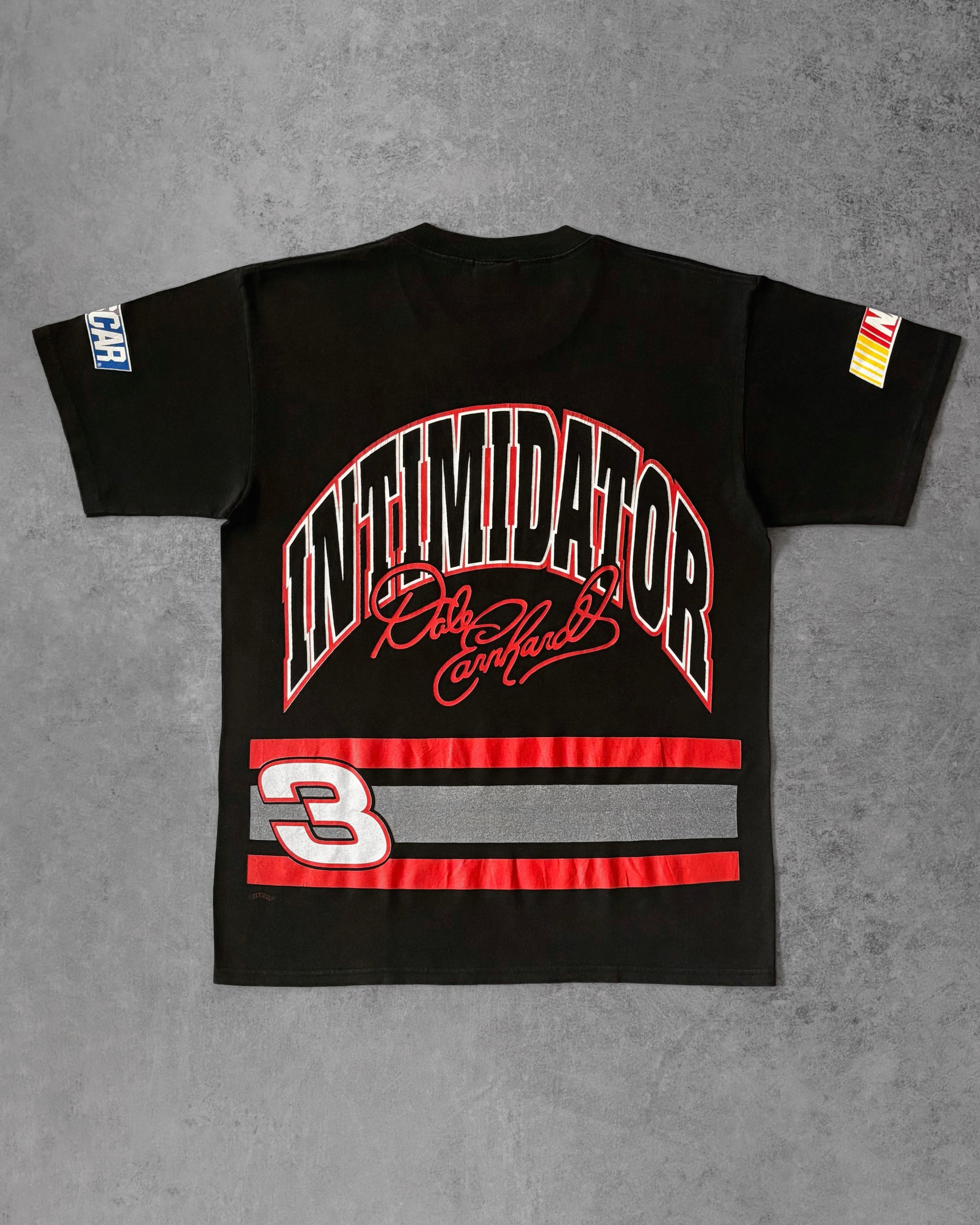T-shirt vintage dei primi–metà anni ’90 dedicata a Dale Earnhardt, soprannominato “The Intimidator”. Presenta una grande grafica ad arco INTIMIDATOR con la firma di Earnhardt e l’iconico numero #3.