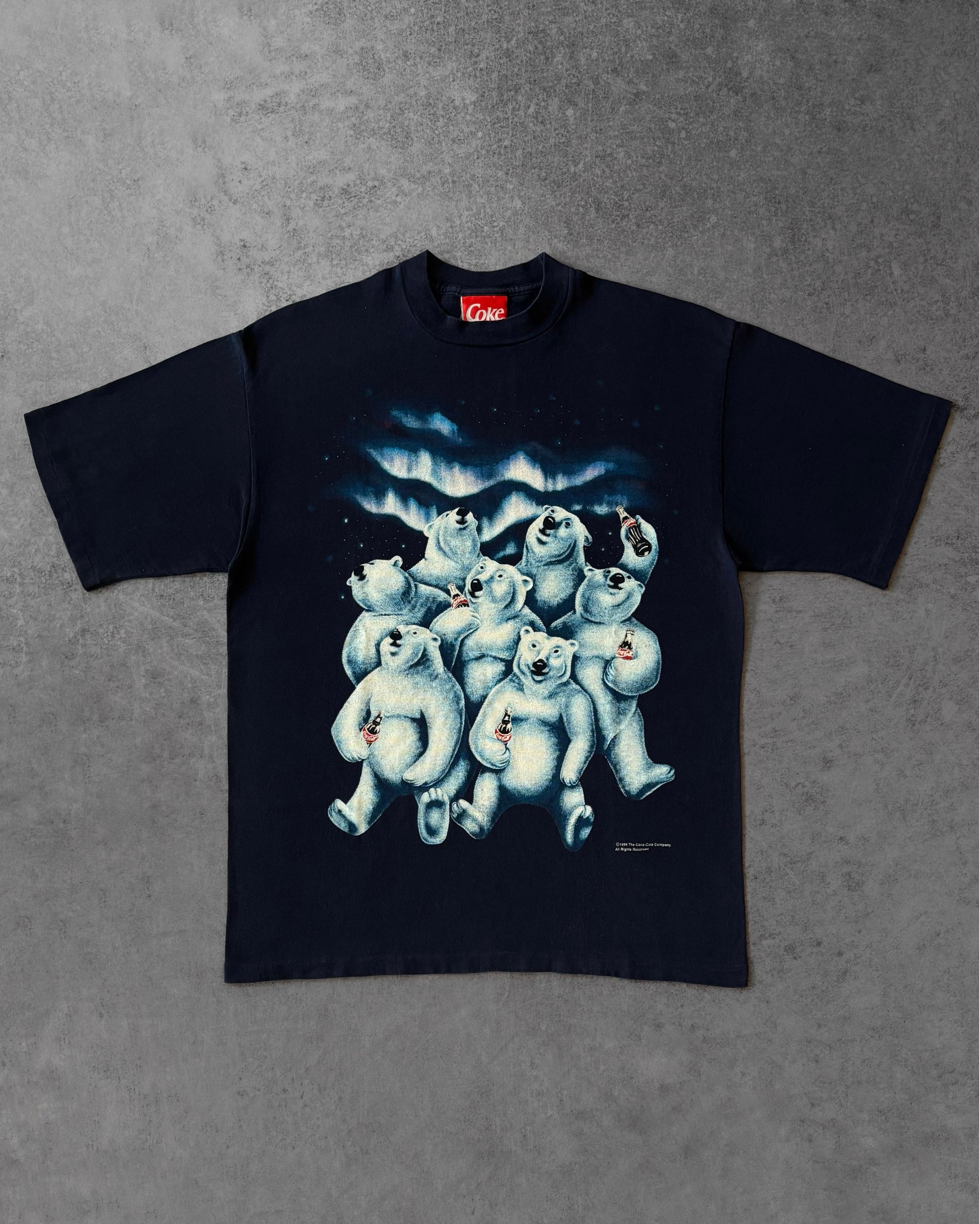 T-shirt vintage originale Coca-Cola del 1994, con la celebre grafica degli orsi polari Coca-Cola, uno dei soggetti pubblicitari più riconoscibili e collezionabili del brand negli anni ’90.