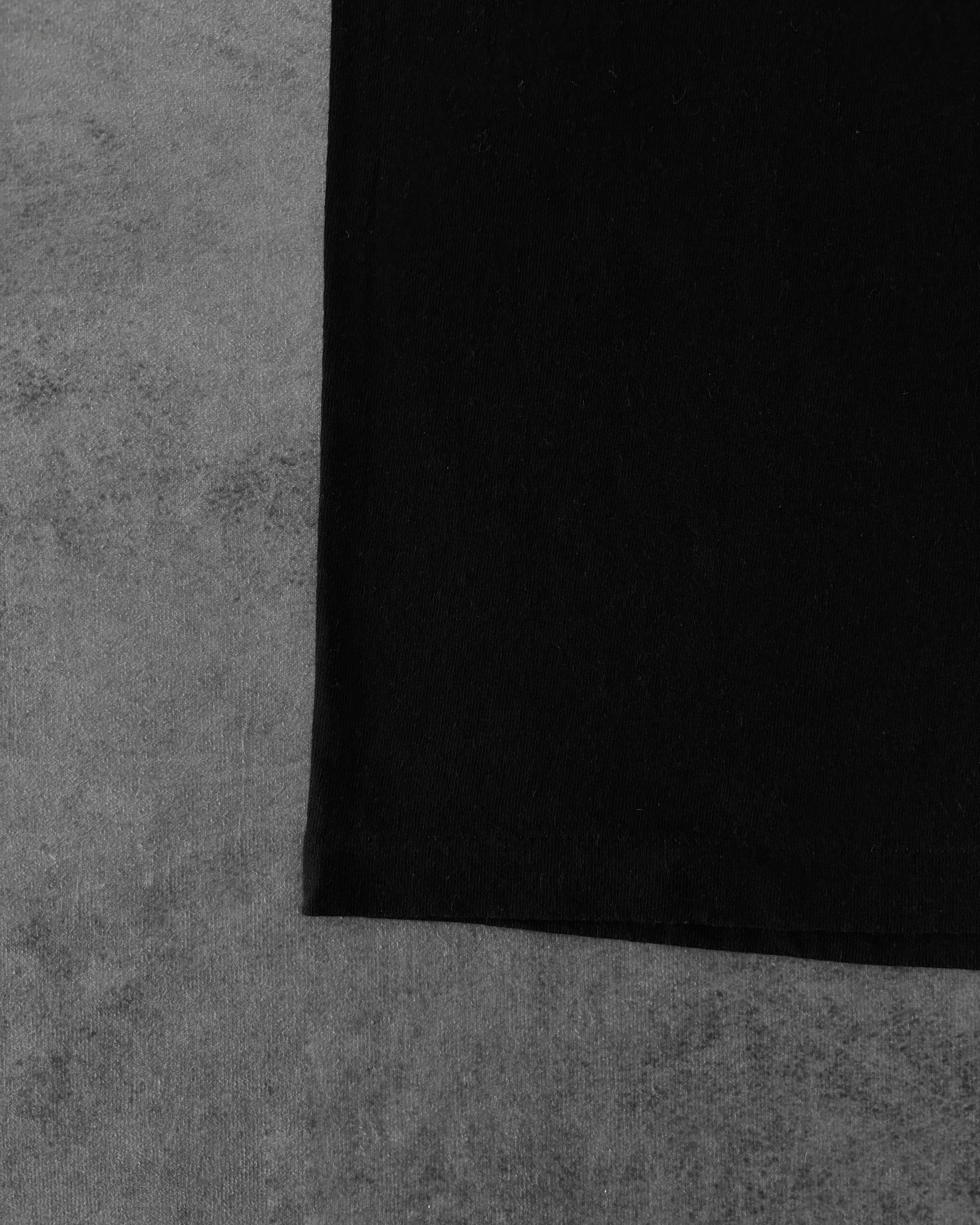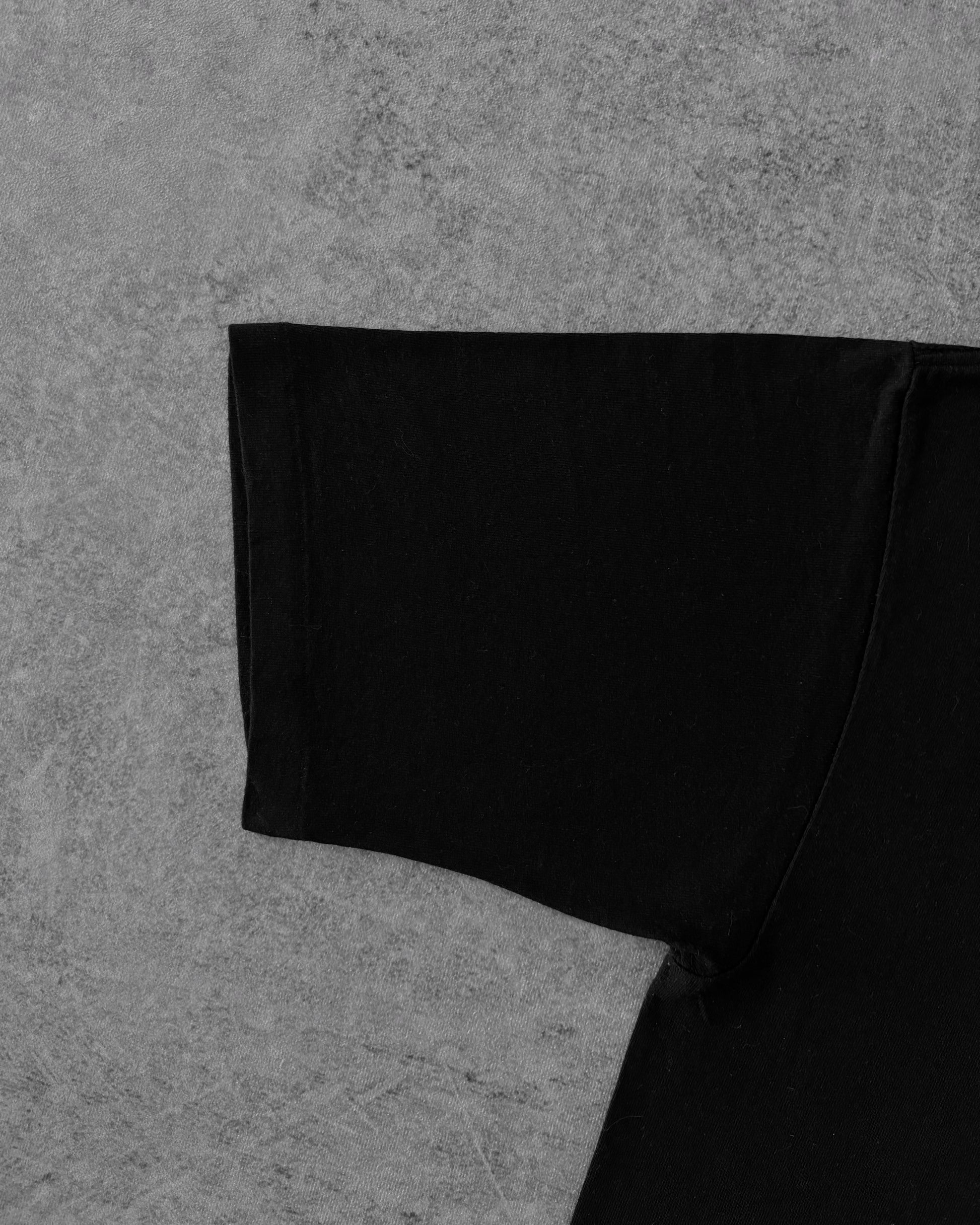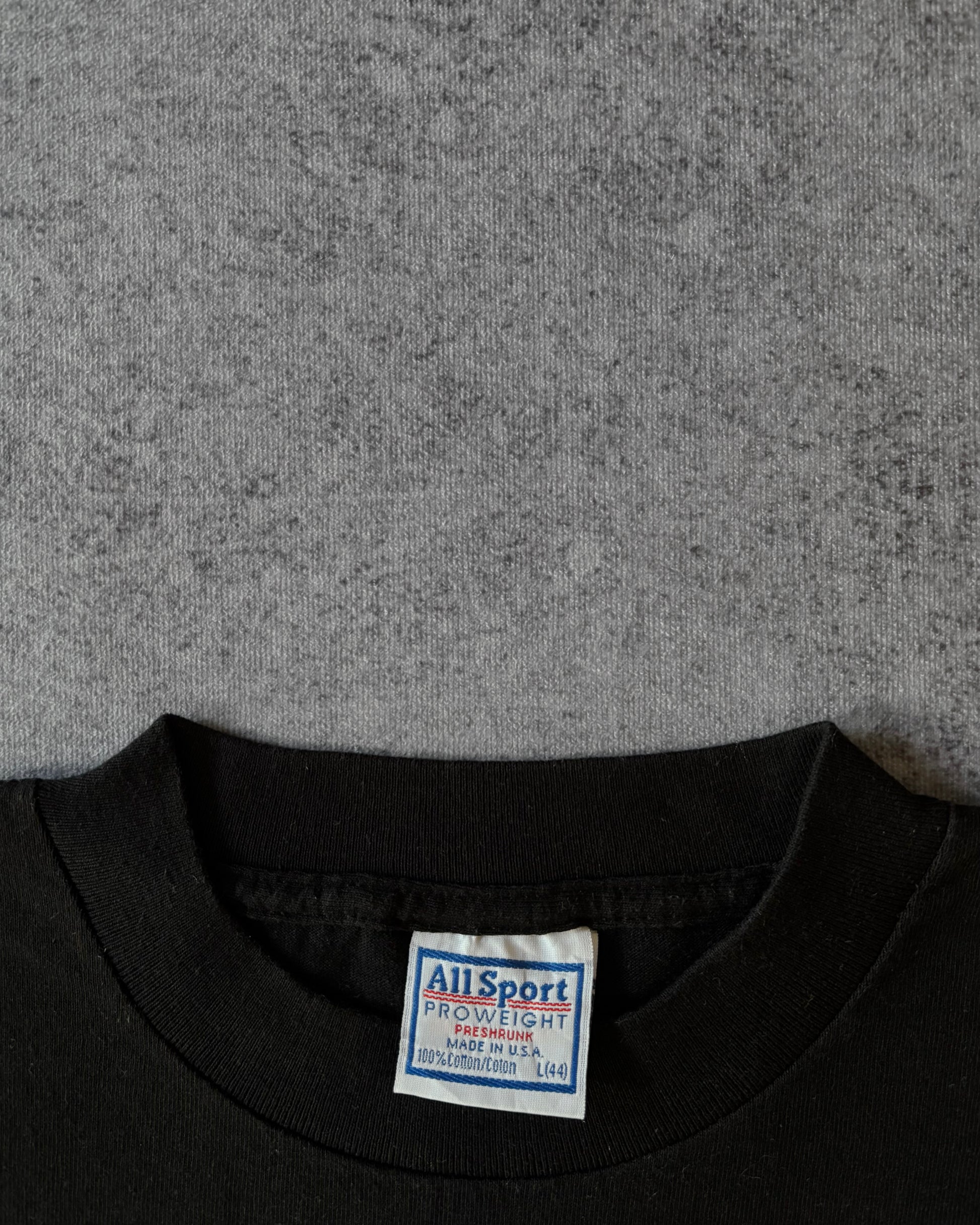 La maglietta è in cotone nero pesante, con il classico fit boxy All Sport, colletto a costine e costruzione robusta tipica della produzione statunitense di metà anni ’90.
