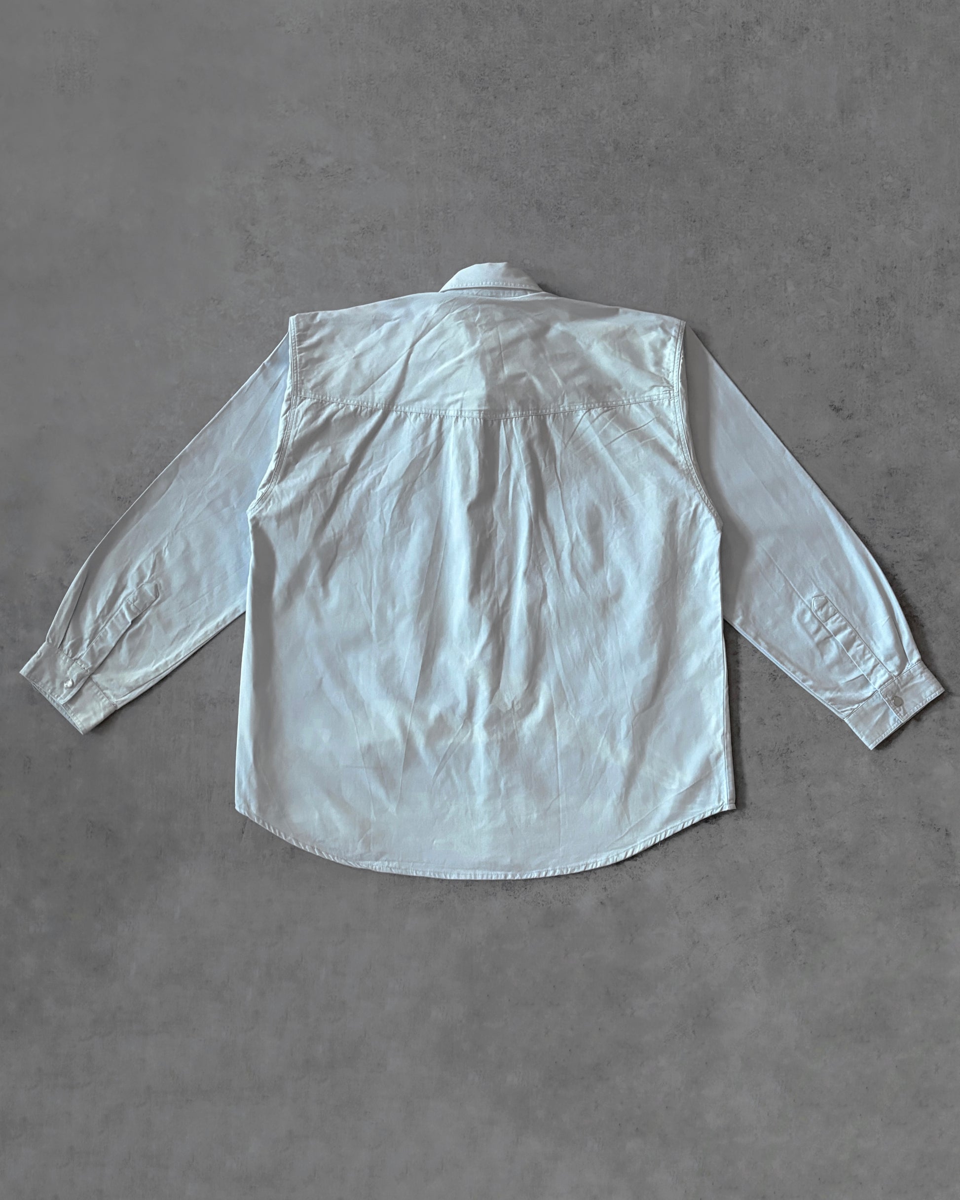 Camicia techwear ufficiale Microsoft dei primi anni 2000 con logo ricamato “Windows 2000 Server” su denim chiaro effetto lavaggio. Probabilmente un pezzo interno distribuito durante il periodo di lancio o in occasione di un evento Microsoft. Una vera capsula del tempo dall’epoca del boom IT della dot-com.