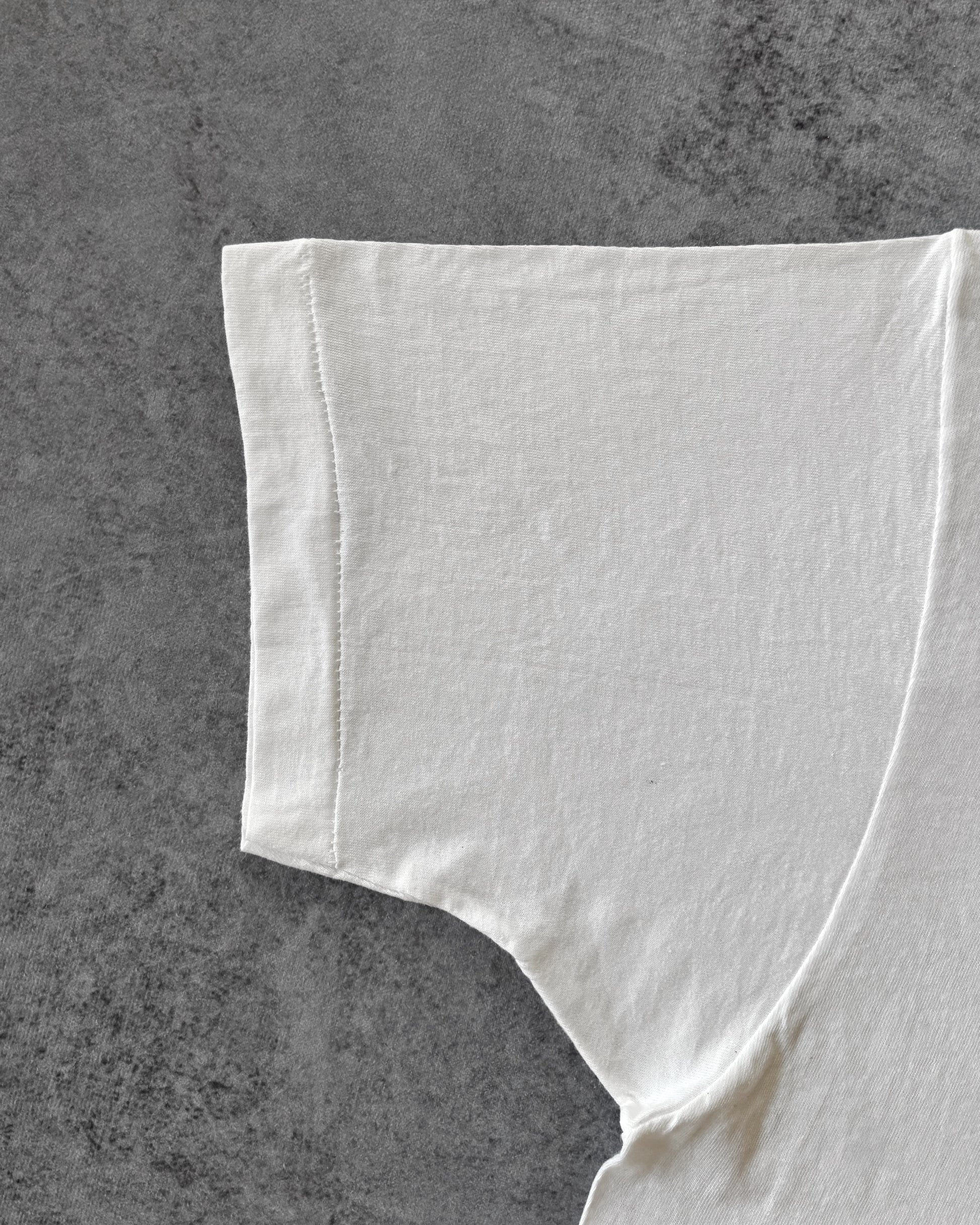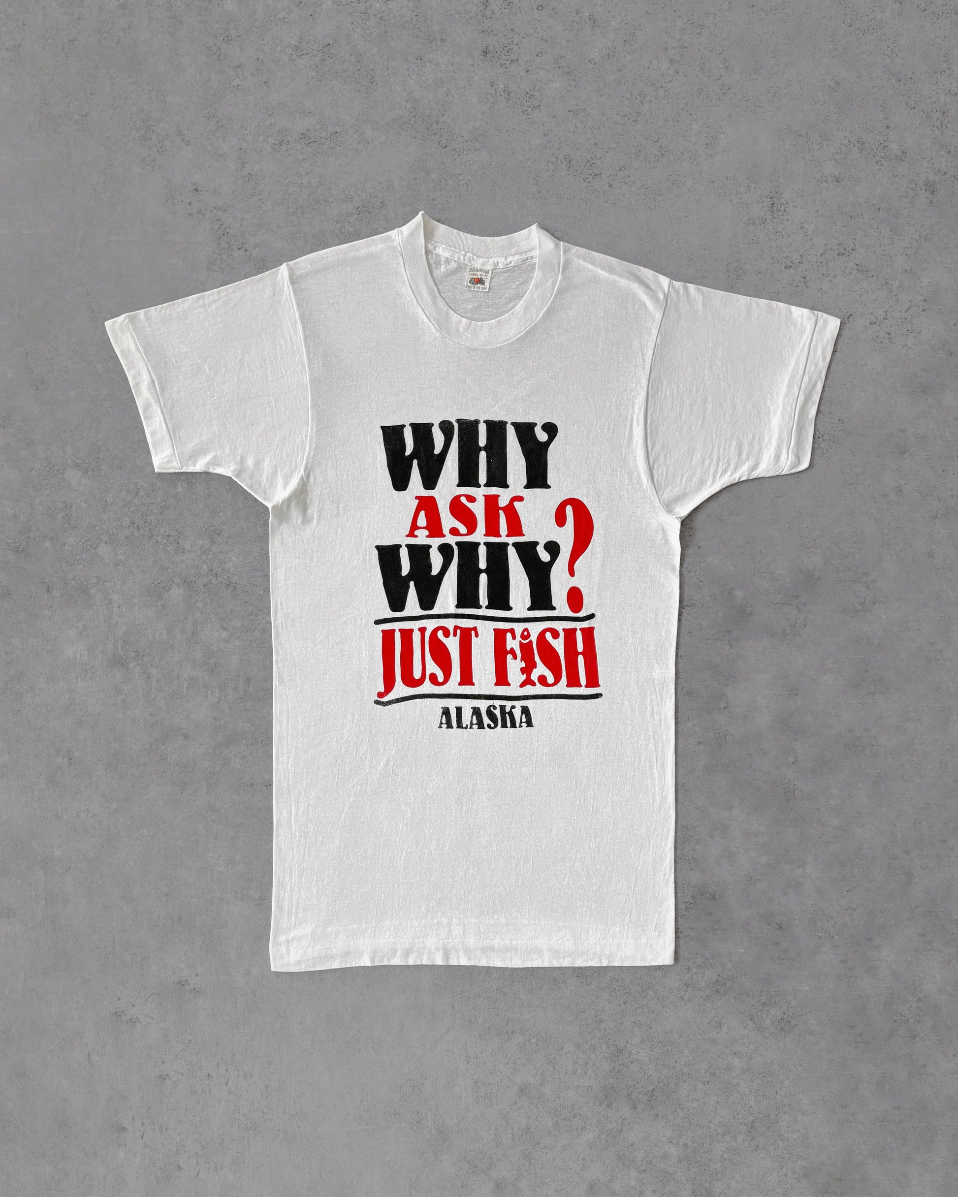 Maglietta souvenir della fine anni ’70 dall’Alaska, con audace scritta rossa e nera: “Why Ask Why? Just Fish – Alaska”. Stampata su una t-shirt bianca Fruit of the Loom Tag, Made in USA.