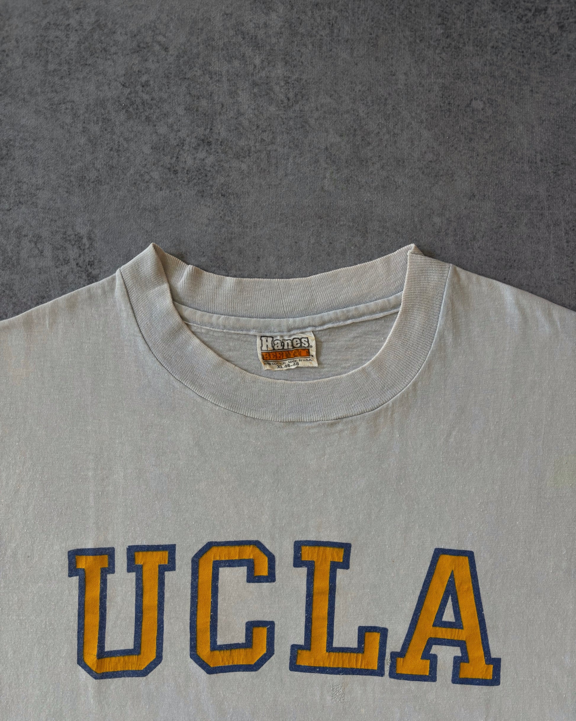 Maglietta vintage UCLA anni ’80, Hanes Beefy-T Made in U.S.A. Con logo UCLA giallo e blu stampato sul petto.