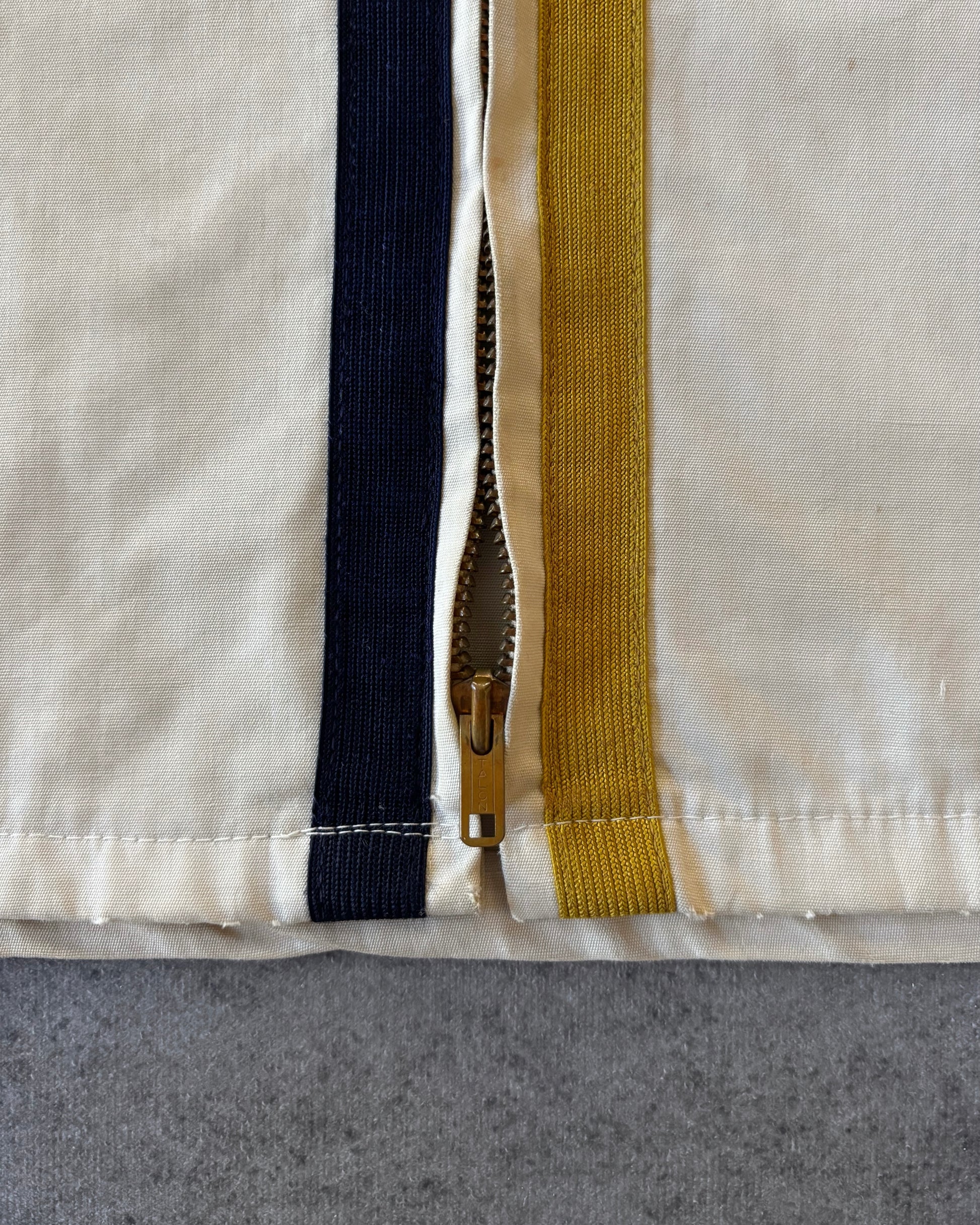 La giacca presenta una chiusura frontale full zip con nastro verticale a contrasto, fissata da una zip TALON in ottone. È realizzata in cotone a trama fitta, tipico dell’outerwear sportivo dell’epoca, e sul petto mostra una stampa serigrafica con la scritta East Tenn. State University.