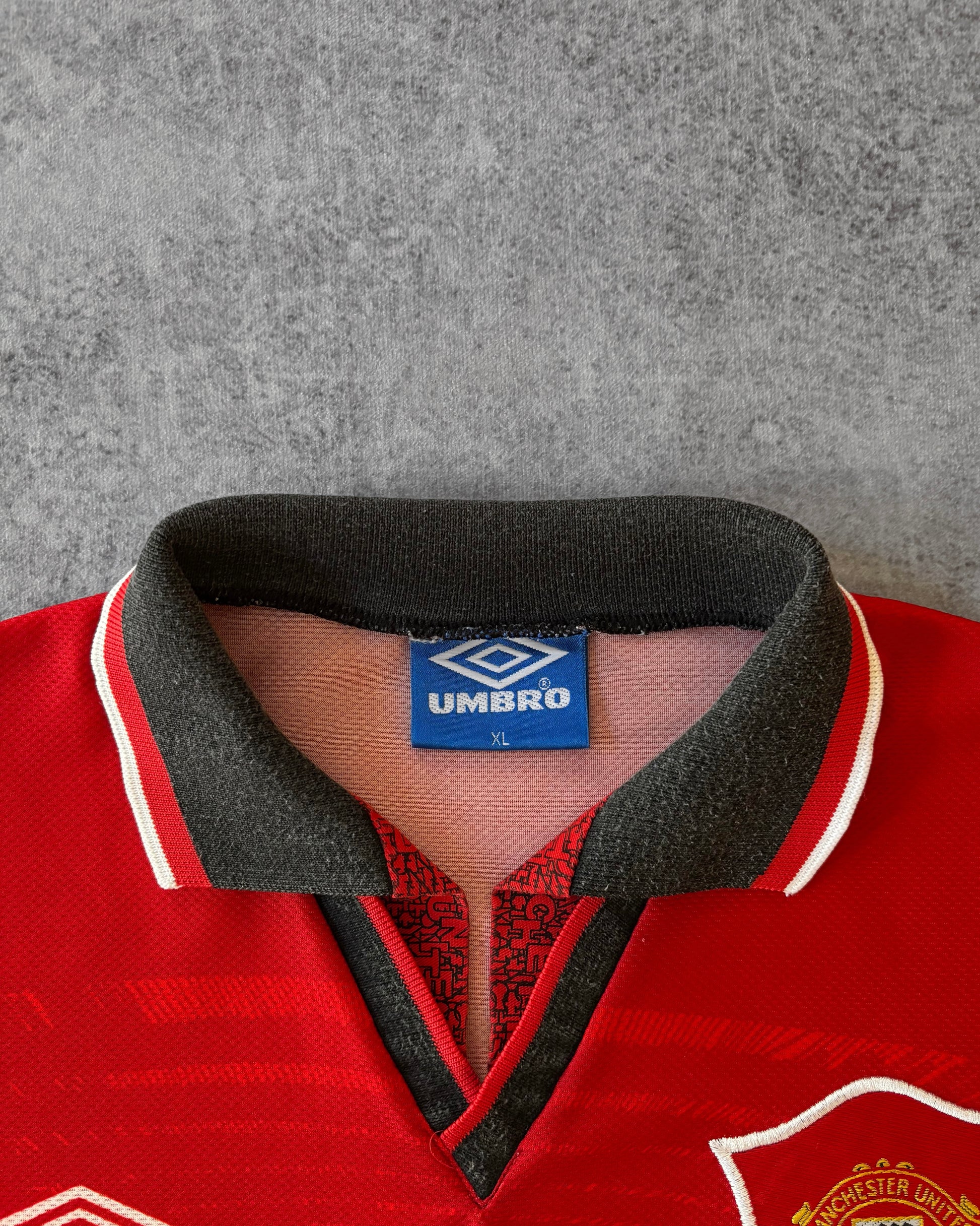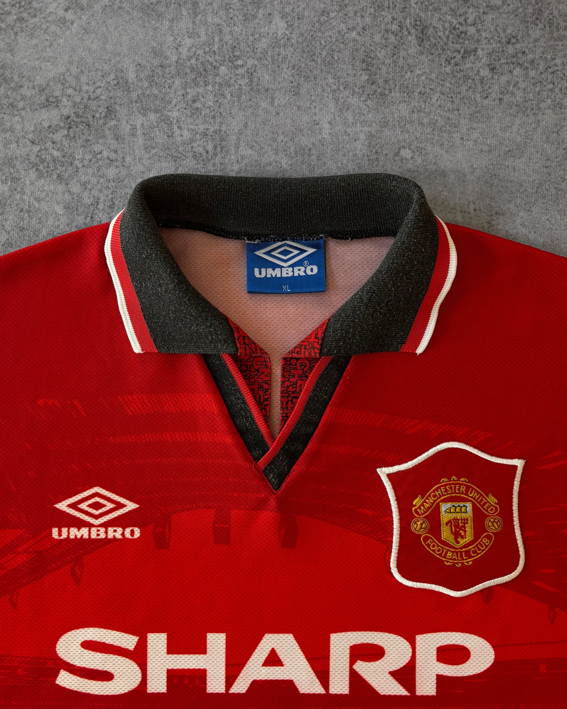 Vintage Manchester United 94/95 Home Jersey – Umbro – Sharp Sponsor – Old Trafford Graphic – XL